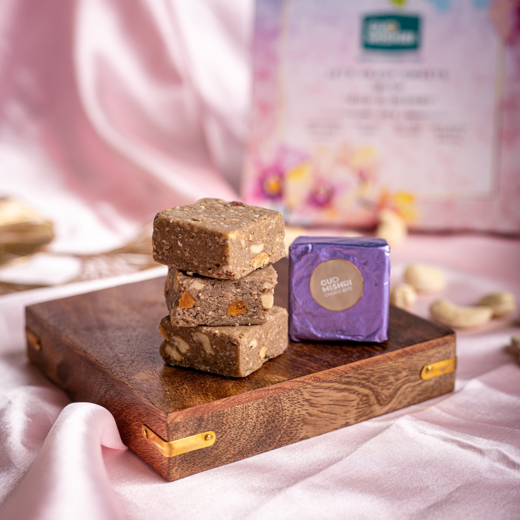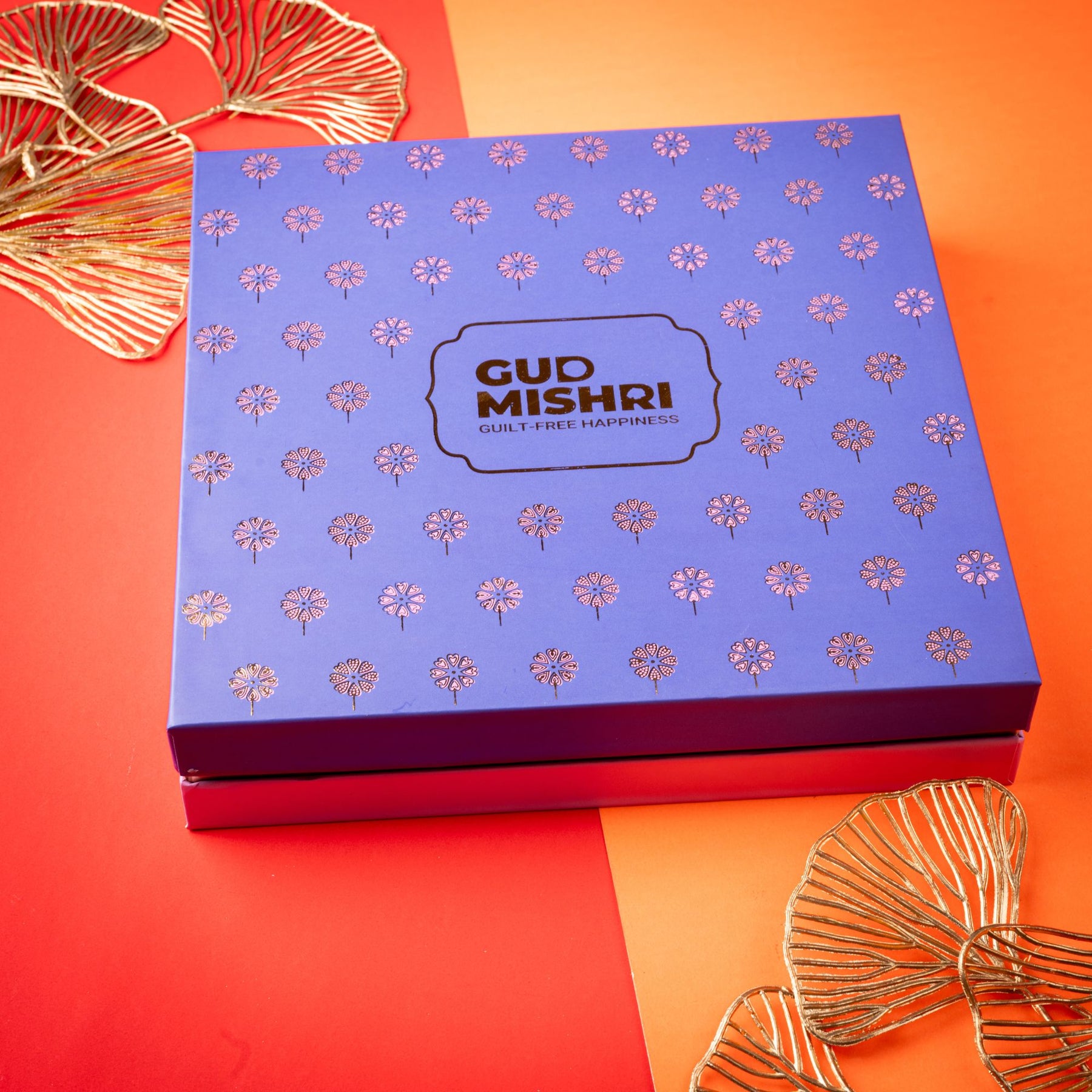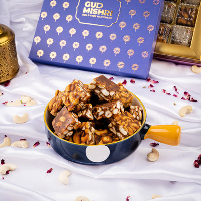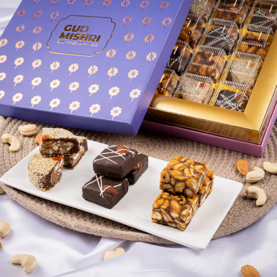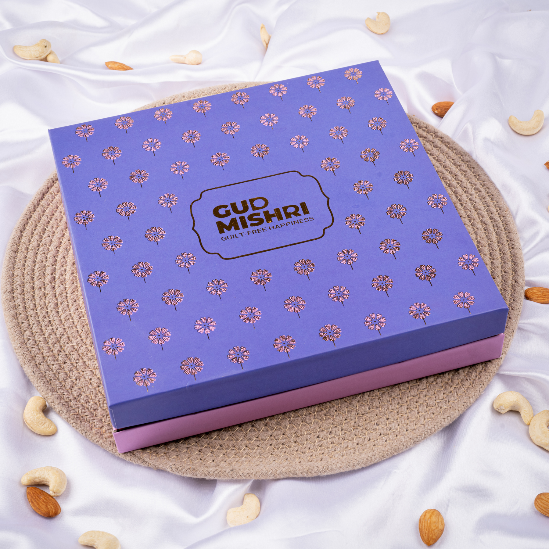 Introducing the Gud Mishri Premium Gifting Box – a thoughtfully curated selection of three exquisite sweets, perfect for celebrating with love and care. It includes Anjeer Joy, made with Anjeer, Kaju, Badam, and Pista, sweetened naturally with Mishri; Gud Kaju Pak, crafted from premium cashews and pure jaggery; and Kaju Choco Pastry, a delightful fusion of rich Kaju, chocolate, and Mishri sweetness. With no added refined sugar, no food color, and only the finest ingredients, this box is a guilt-free, heartwarming gift for your special ones.