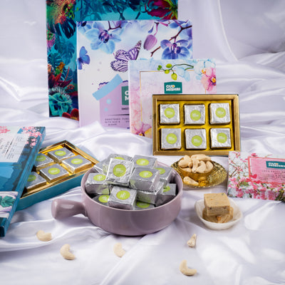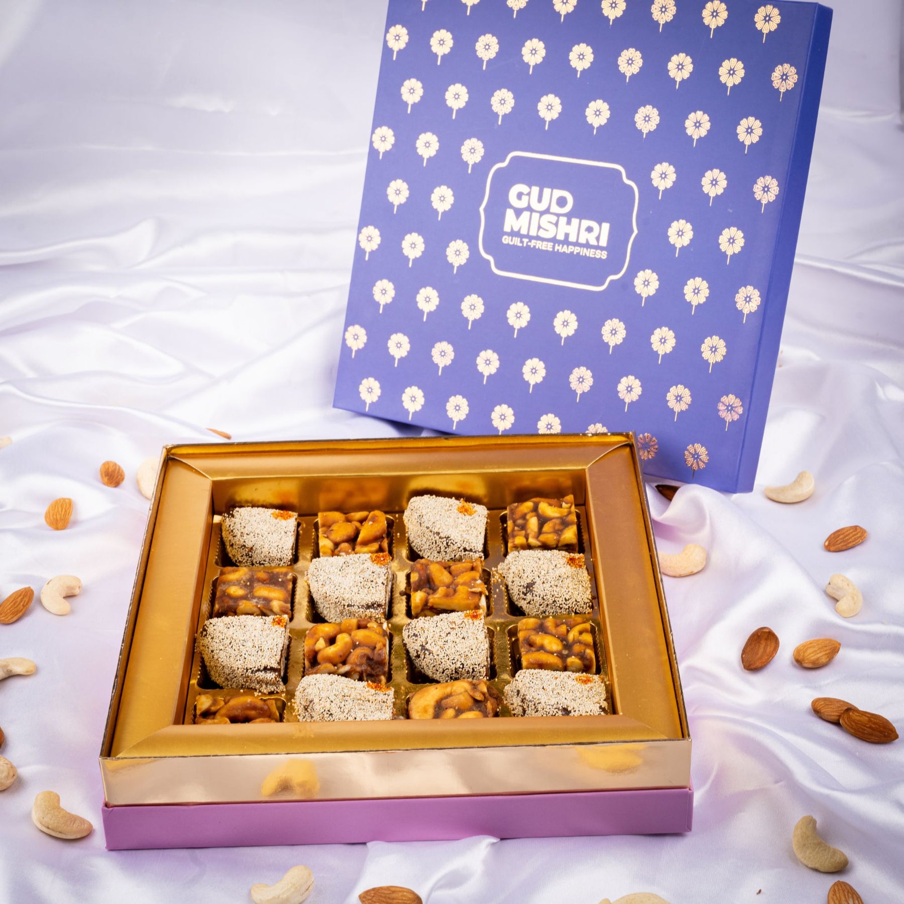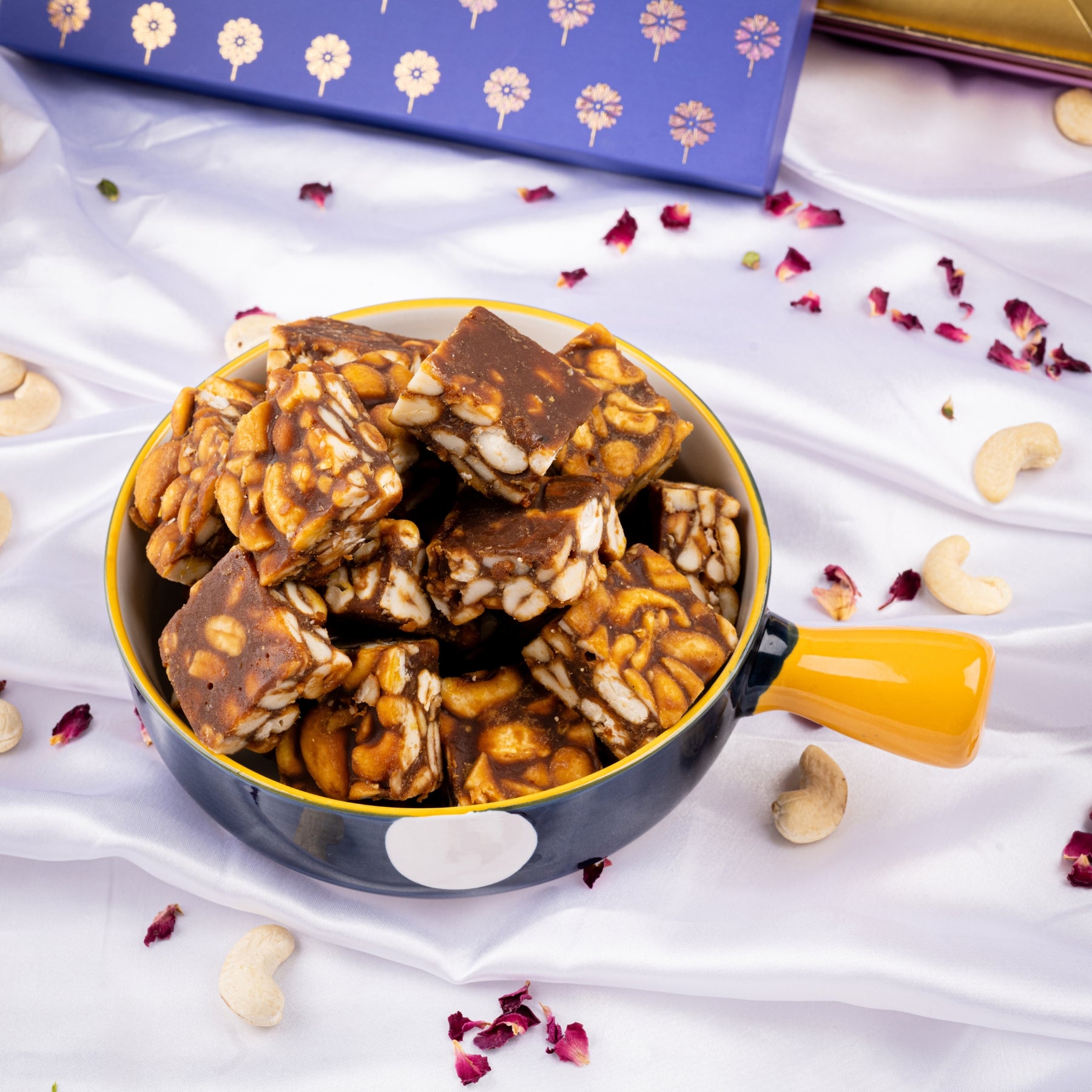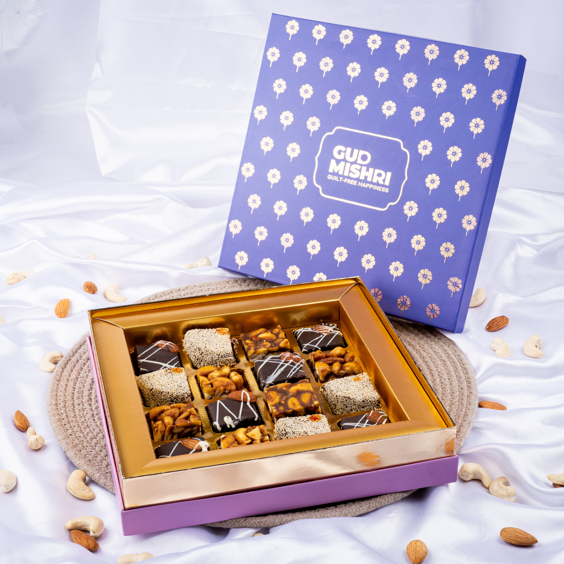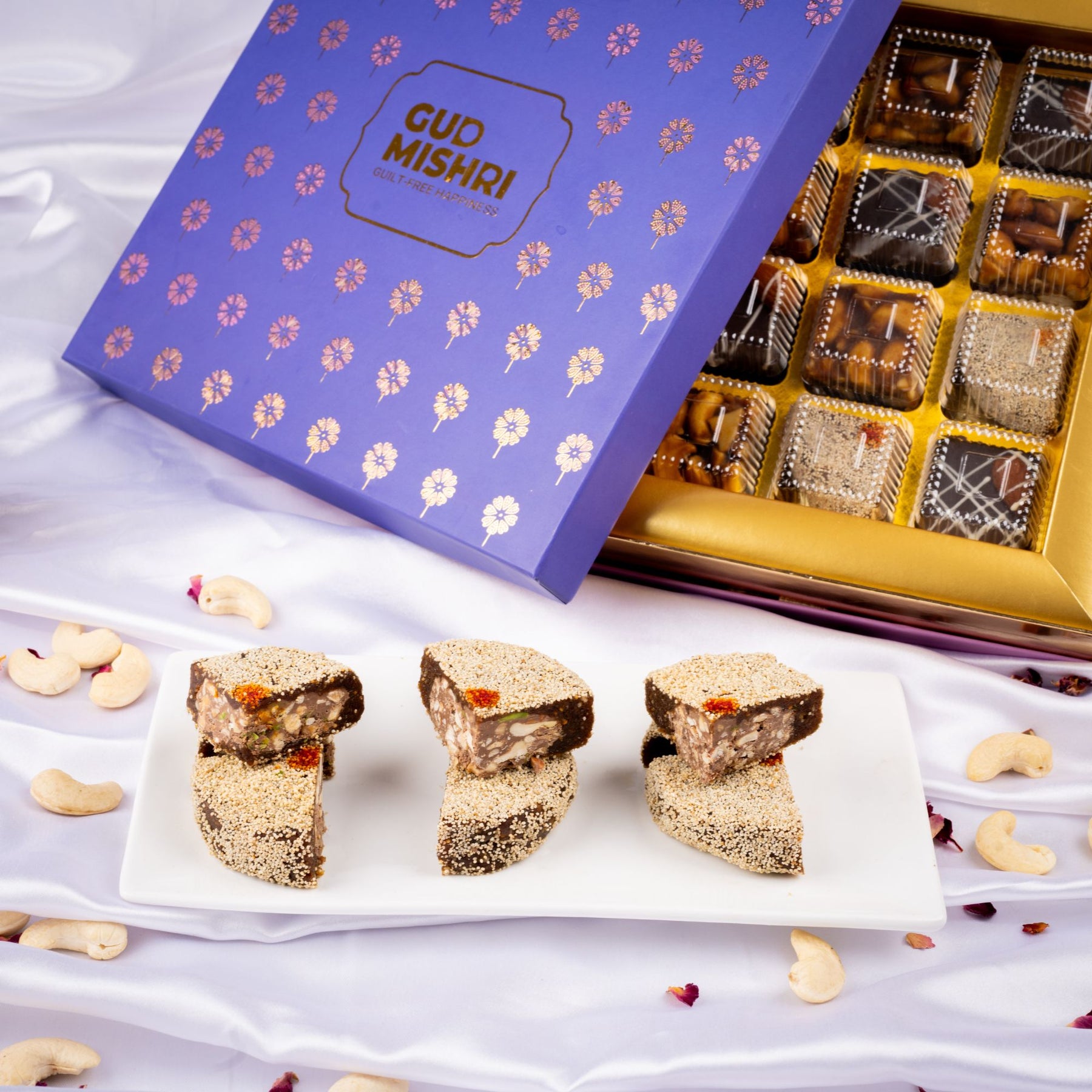 Introducing the Gud Mishri Premium Gifting Box – a thoughtfully curated selection of three exquisite sweets, perfect for celebrating with love and care. It includes Anjeer Joy, made with Anjeer, Kaju, Badam, and Pista, sweetened naturally with Mishri; Gud Kaju Pak, crafted from premium cashews and pure jaggery; and Kaju Choco Pastry, a delightful fusion of rich Kaju, chocolate, and Mishri sweetness. With no added refined sugar, no food color, and only the finest ingredients, this box is a guilt-free, heartwarming gift for your special ones.