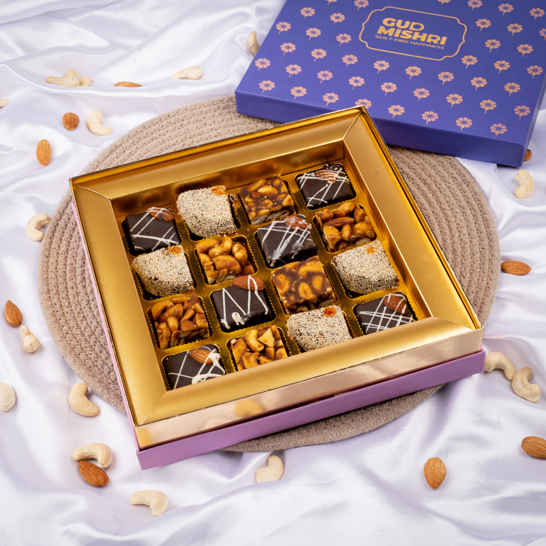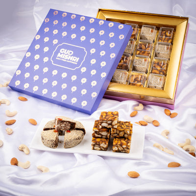 Gud Mishri Gud Chana Badam Barfi is a healthy, delicious treat made from premium quality chana and badam (almonds), naturally sweetened with Gud (jaggery) instead of refined sugar. This Indian traditional sweet is crafted with no artificial colors, ensuring a pure and authentic flavor. Perfect for those looking for guilt-free sweets, it offers a wholesome alternative to sugary treats. With a long shelf life of over 3 months, it remains fresh for longer, making it an ideal sweet for gifting choice. Enjoy the goodness of traditional sweets in a healthier form!