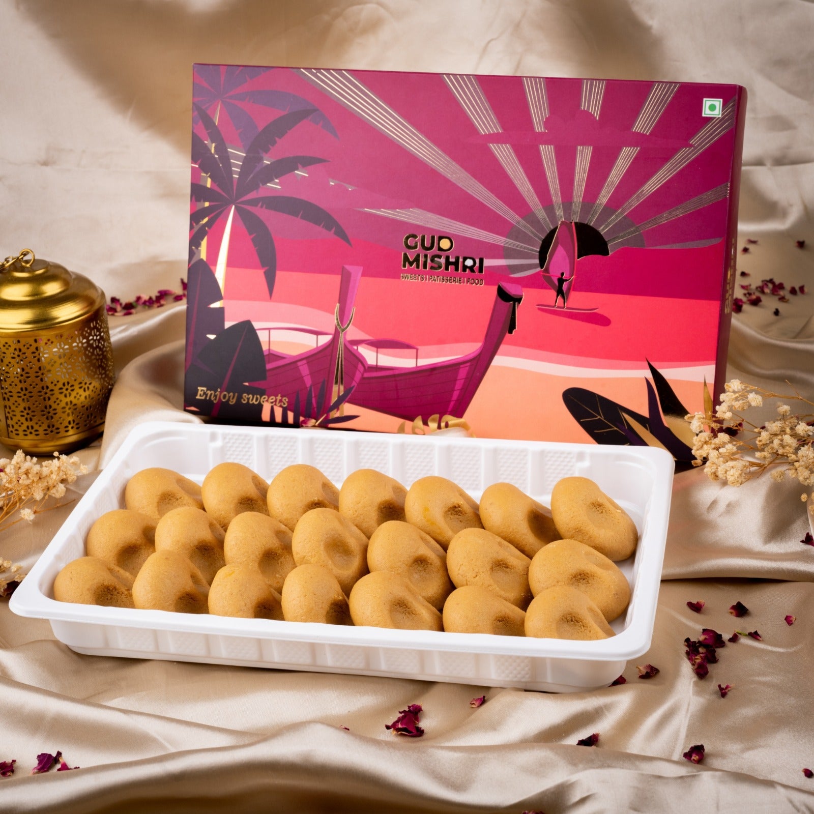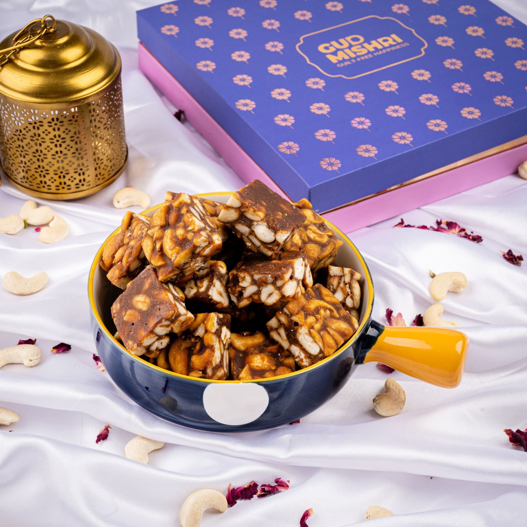 Gud Mishri’s Kaju Katli Gud is a wholesome, guilt-free treat that combines the richness of premium cashews with the natural sweetness of Gud (jaggery), instead of refined sugar. This delicious Indian traditional sweet is crafted without any artificial food colors, ensuring a pure, authentic taste. Made with the finest ingredients, it’s not only a healthy option but also a delightful indulgence. Perfect for gifting during festivals or special occasions, Gud Mishri’s Kaju Katli Gud is the ideal choice for those seeking a healthier, yet flavorful alternative to traditional sweets. Savor tradition with every bite!