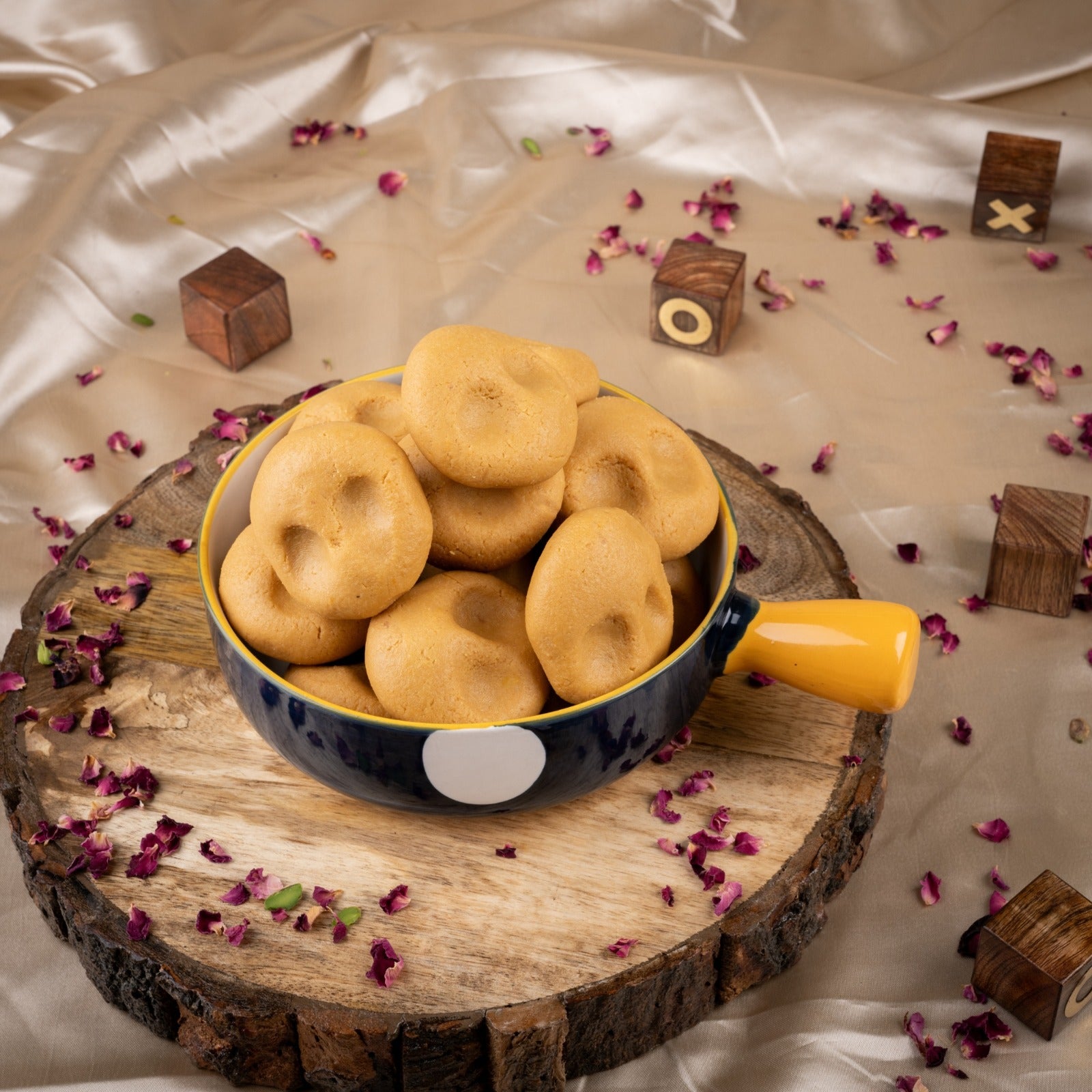 Gud Mishri Sugar-Free Cookies (280g) – Enjoy a delicious and healthy treat with Gud Mishri Sugar-Free Cookies. Made with whole wheat instead of Maida, these whole wheat cookies are packed with fibre and nutrients, offering a healthier alternative to traditional cookies. We sweeten them naturally with Mishri (rock sugar) instead of refined sugar, making them completely sugar-free while still providing a mild, natural sweetness.