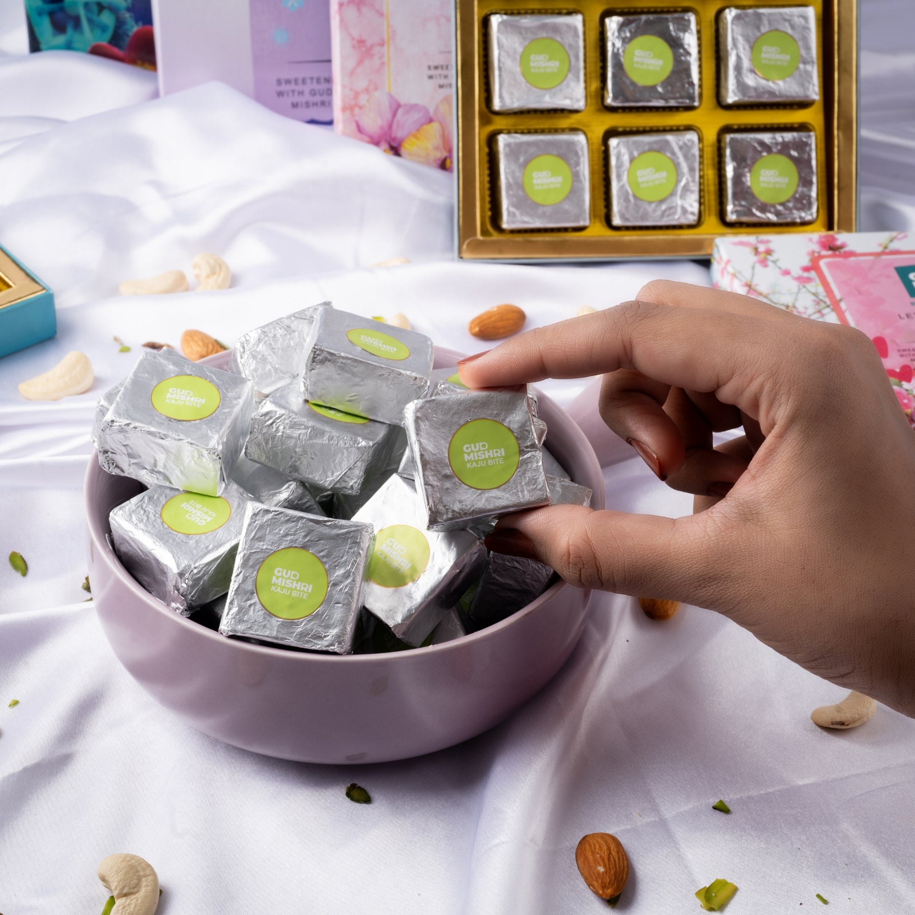 Gud Mishri’s Kaju Bite is a delicious and guilt-free treat made with the best premium cashews, naturally sweetened with Mishri instead of refined sugar this sweet offers the authentic, rich flavors of traditional Indian sweets, without any artificial food colors. It’s a wholesome snack that’s both tasty and nutritious, making it a perfect healthier alternative. Whether you're treating yourself or looking for a thoughtful gift during festivals or special occasions, Gud Mishri’s Kaju Bite brings the perfect blend of tradition and goodness in every bite. Enjoy your sweet indulgence, guilt-free!