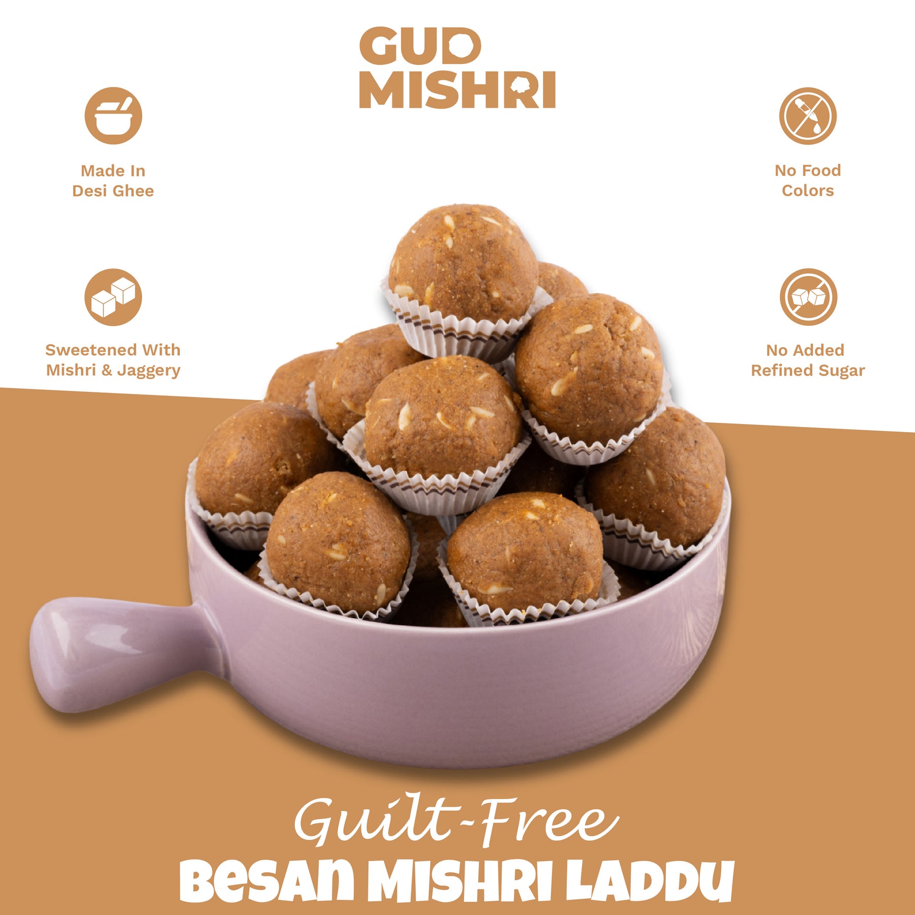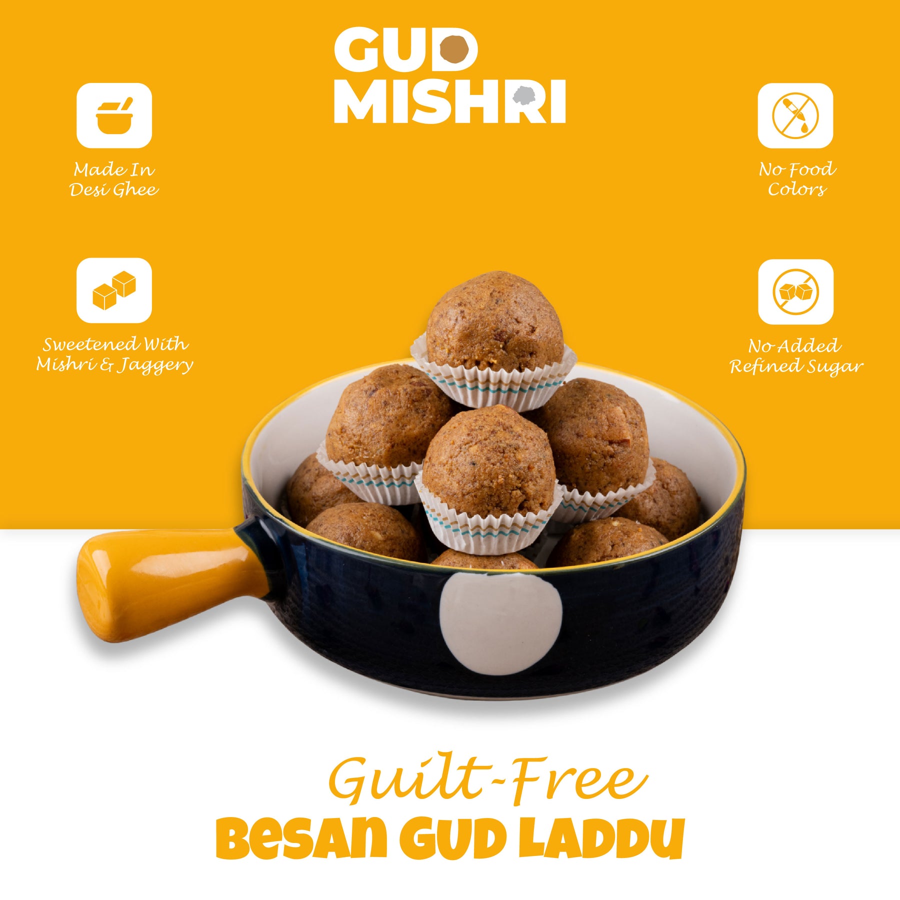 Gud Mishri Besan Laddu Gud is a healthier version of the classic Indian traditional sweets. Made with premium quality besan (gram flour) and naturally sweetened with jaggery, these laddus are free from refined sugar and artificial food color. Perfect for those looking for guilt-free sweets, these laddus combine the goodness of wholesome ingredients with the rich taste of jaggery. Ideal for sweets for gifting, they make a thoughtful and healthy treat for any occasion. Relish the authentic flavors of tradition in every bite