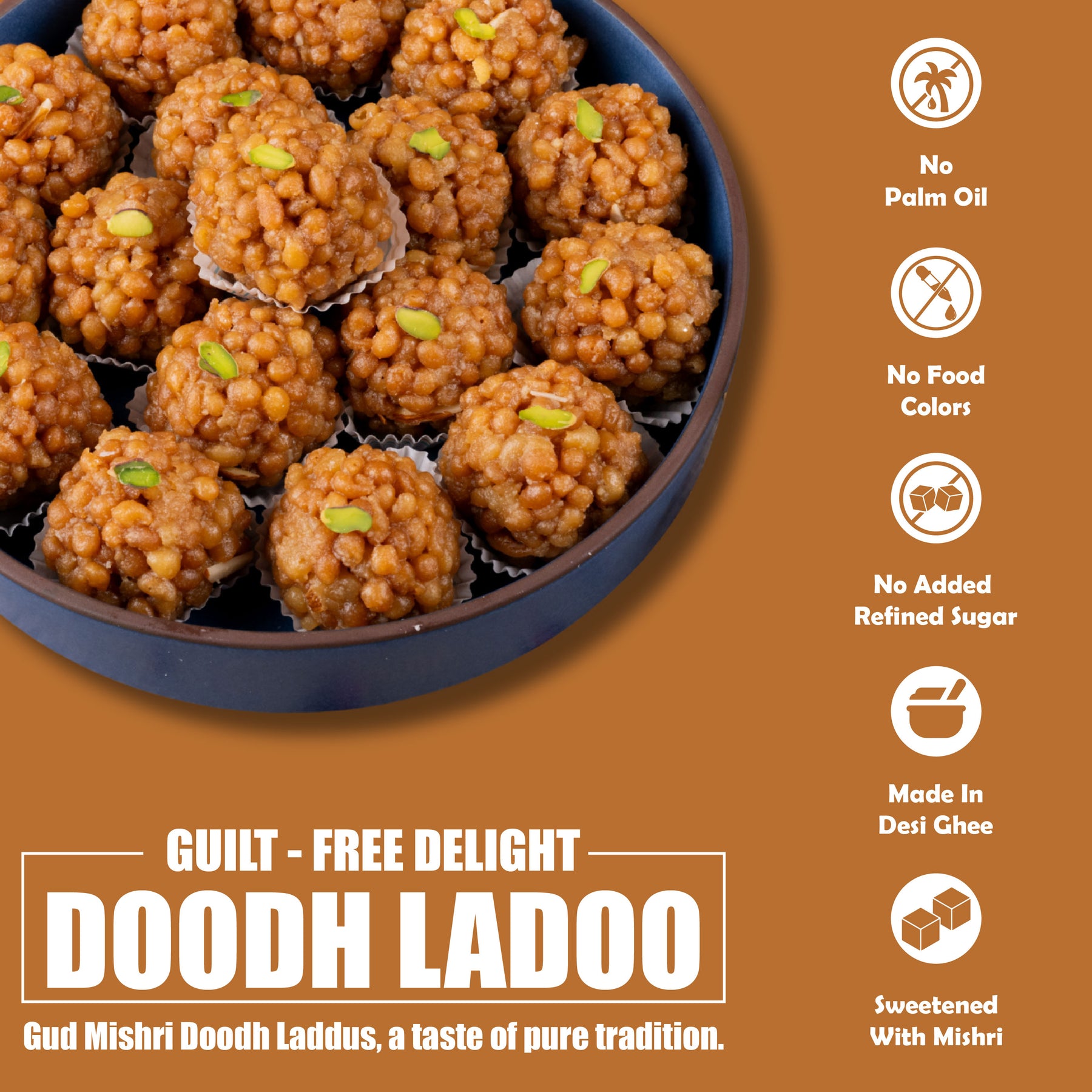 Craving sweets, but your health guilt is holding you back? No need to sacrifice your sweet joy anymore! Our shudh desi ghee sweets are made with love and sweetened with the goodness of premium natural ingredients, most special of which are Gud (jaggery) and Mishri (rock sugar).