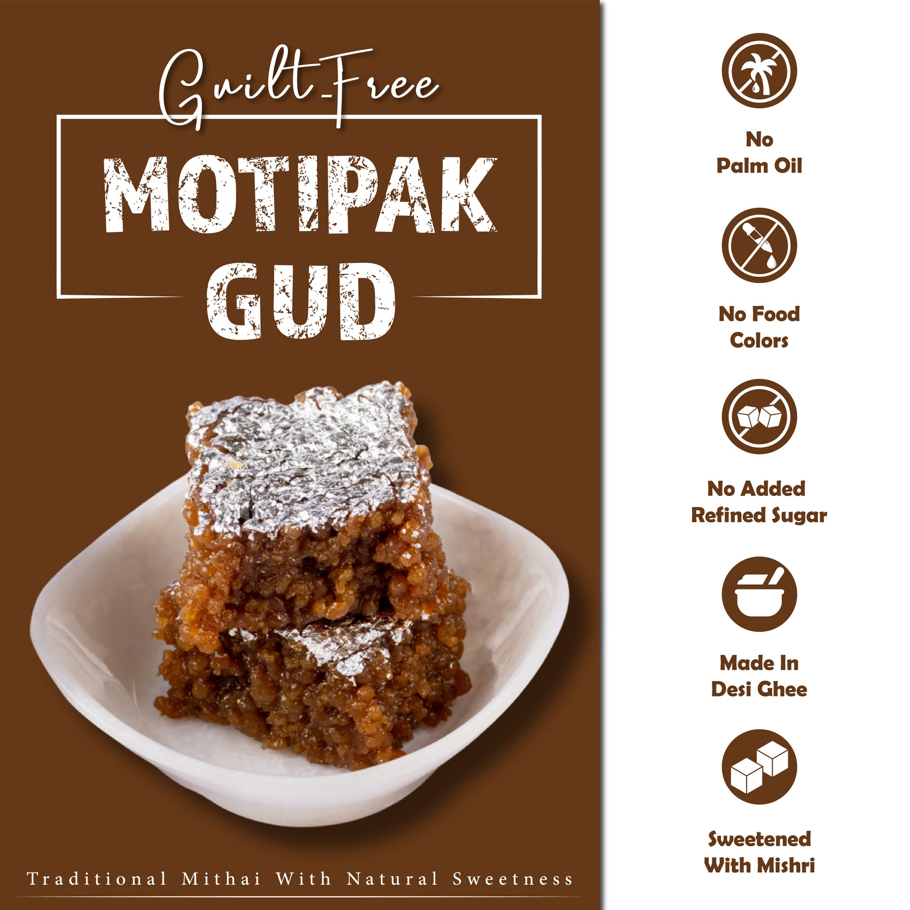 Gud Moti Pak – A rich festive sweet crafted with love using homemade mawa, slow-roasted in pure desi ghee, and sweetened naturally with gud instead of refined sugar. Each soft, melt-in-mouth piece carries the warmth of tradition and the goodness of pure ingredients, making it a perfect choice for celebrations, gifting, or simply indulging in a moment of comfort.