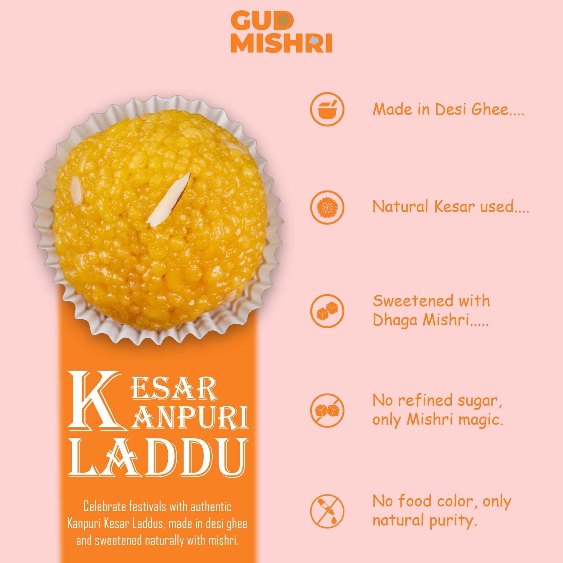 Gud Mishri Kesar Kanpuri Laddu is a delicious twist on traditional Indian sweets, sweetened with Mishri instead of refined sugar, ensuring a healthier treat. Made with premium quality ingredients and infused with the rich flavor of kesar (saffron), these laddus are free from artificial food colors, offering an authentic taste of tradition. Perfect as guilt-free sweets, they provide a nourishing indulgence without compromising on flavor. These laddus are also an ideal choice for sweets for gifting on special occasions. Enjoy the taste of tradition with every bite of Kesar Kanpuri Laddu!