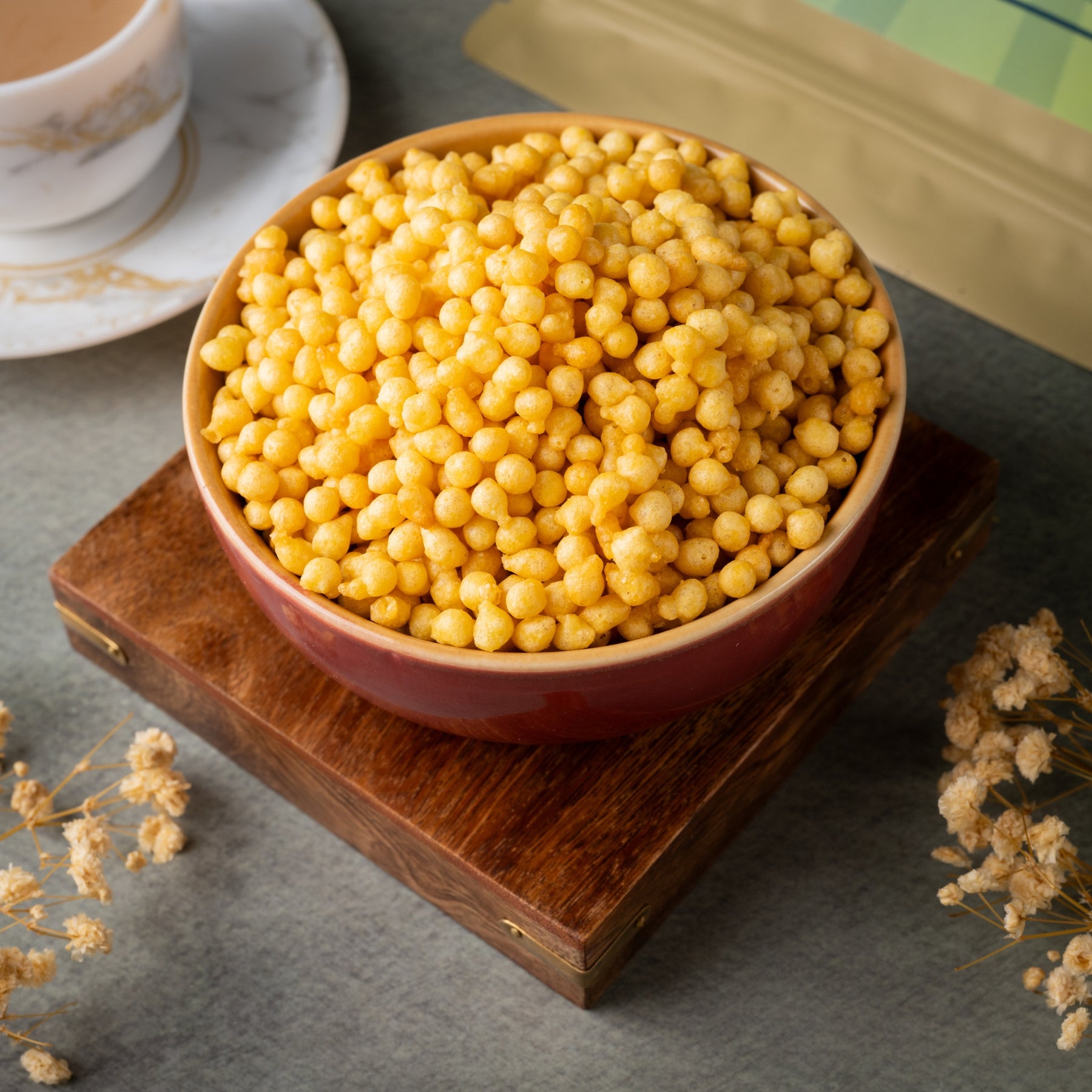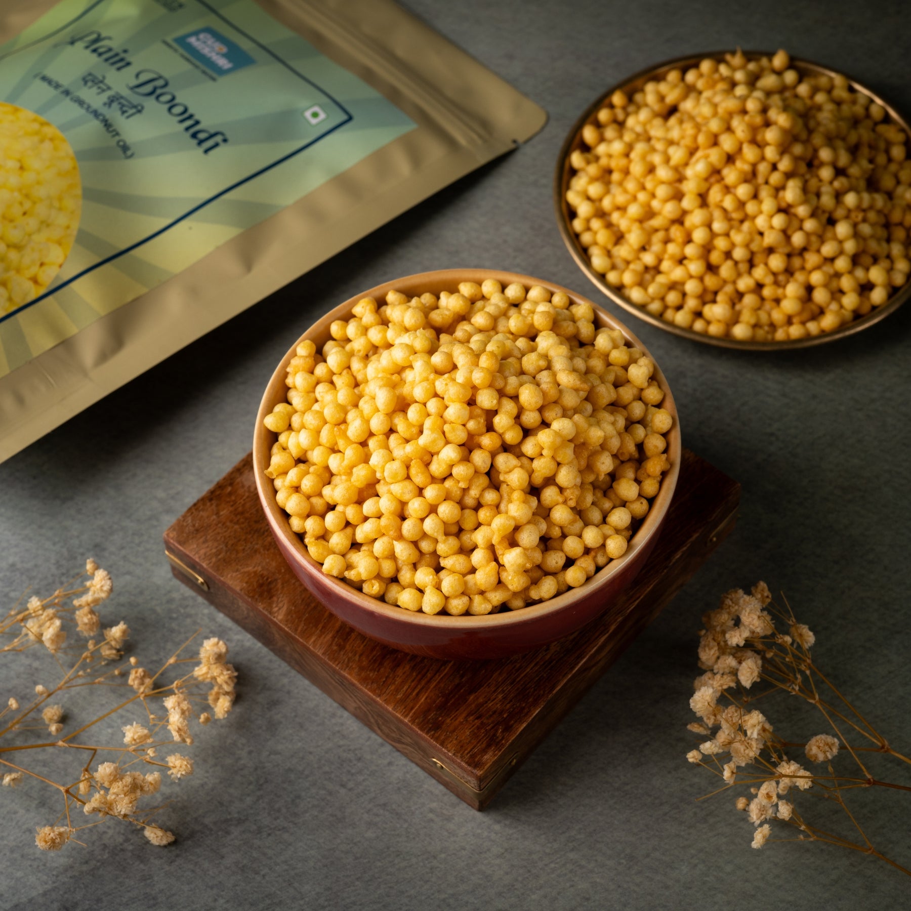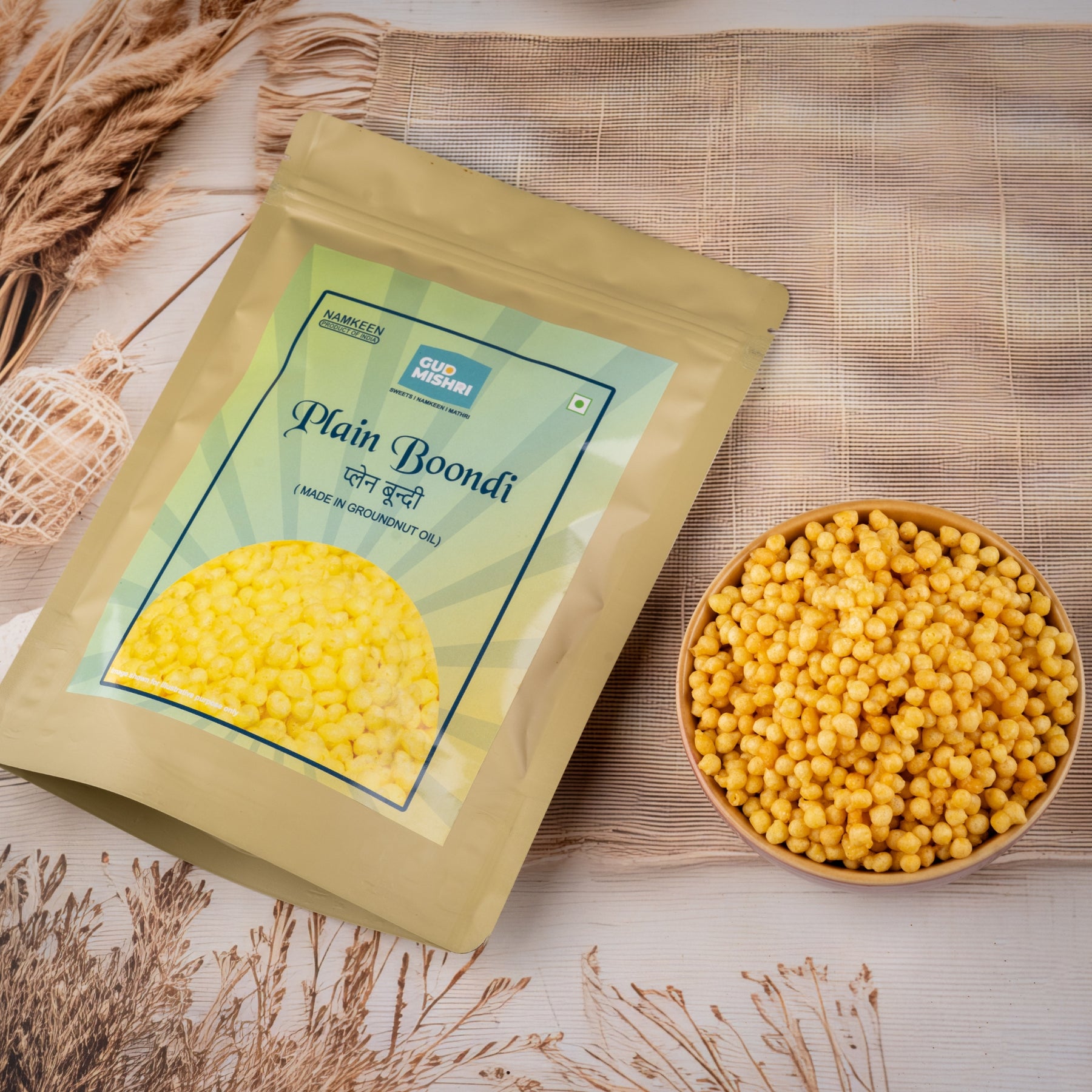 Our Masala Boondi is made with gram flour and fried in pure groundnut oil — no palm oil, just real taste.