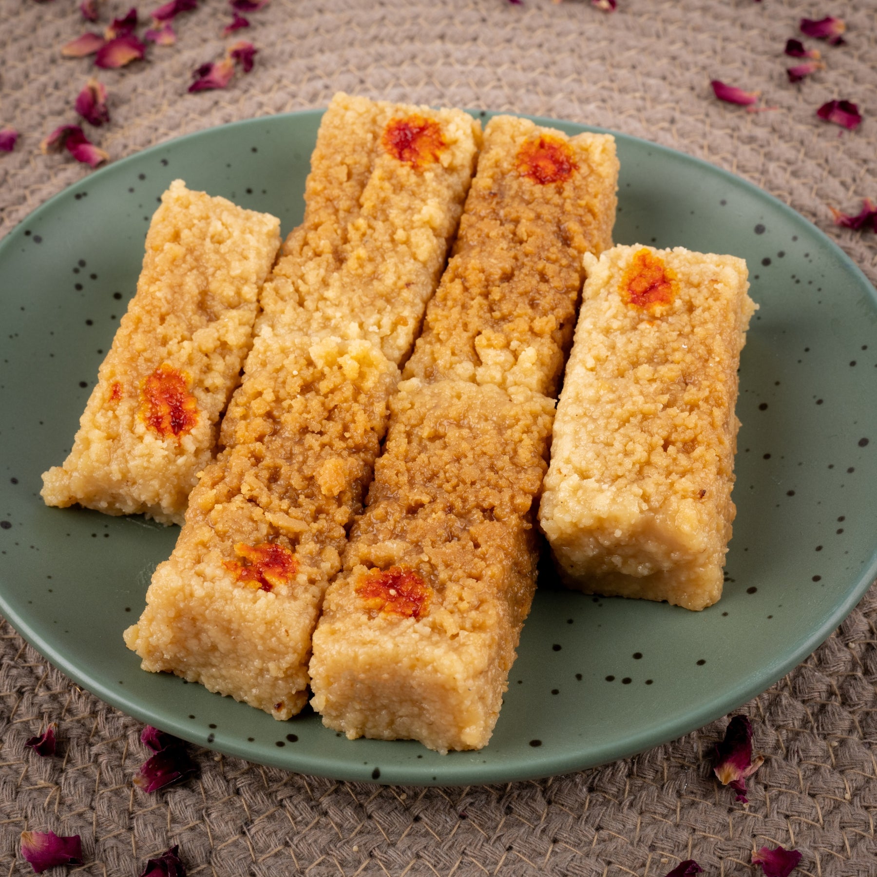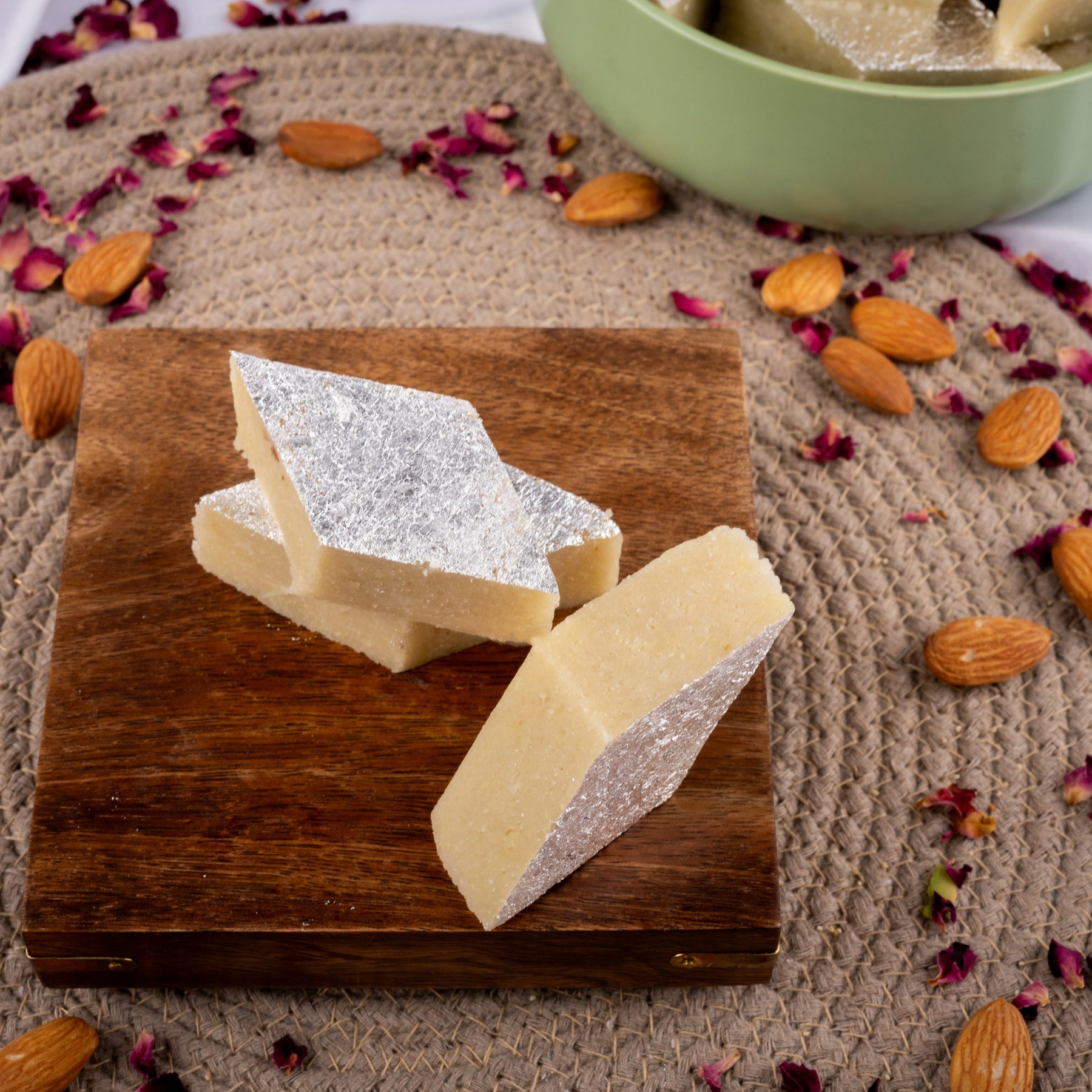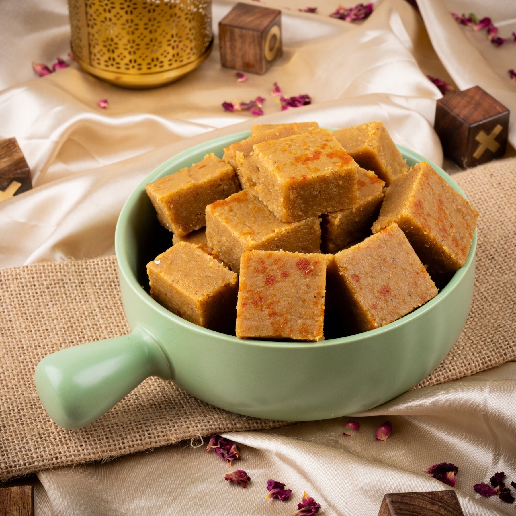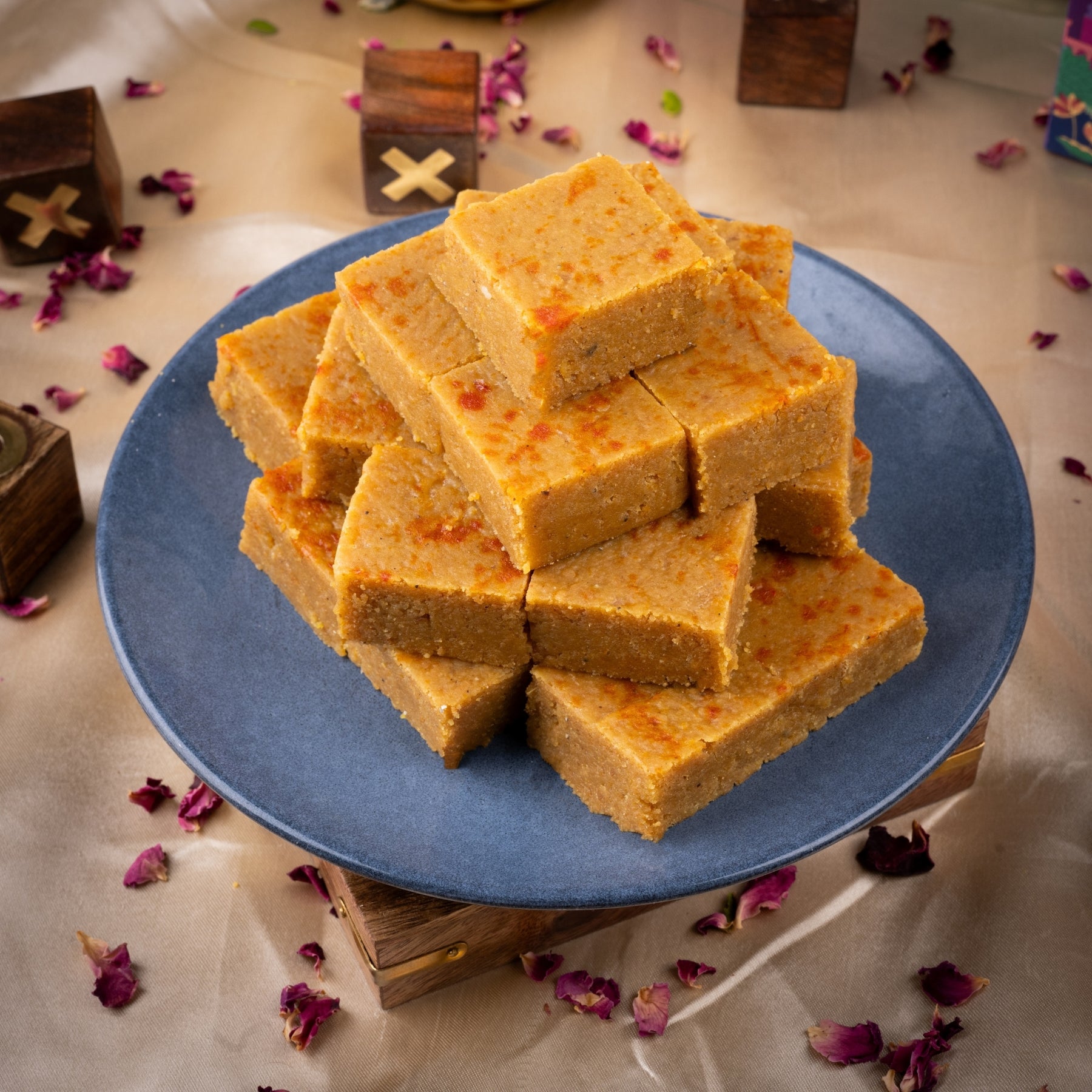 Kesar Badam Katli – A rich, saffron-infused delight made with premium almonds and the natural goodness of kesar. Free from refined sugar, milk powder, mawa, and artificial colors – just pure, golden indulgence in every bite.