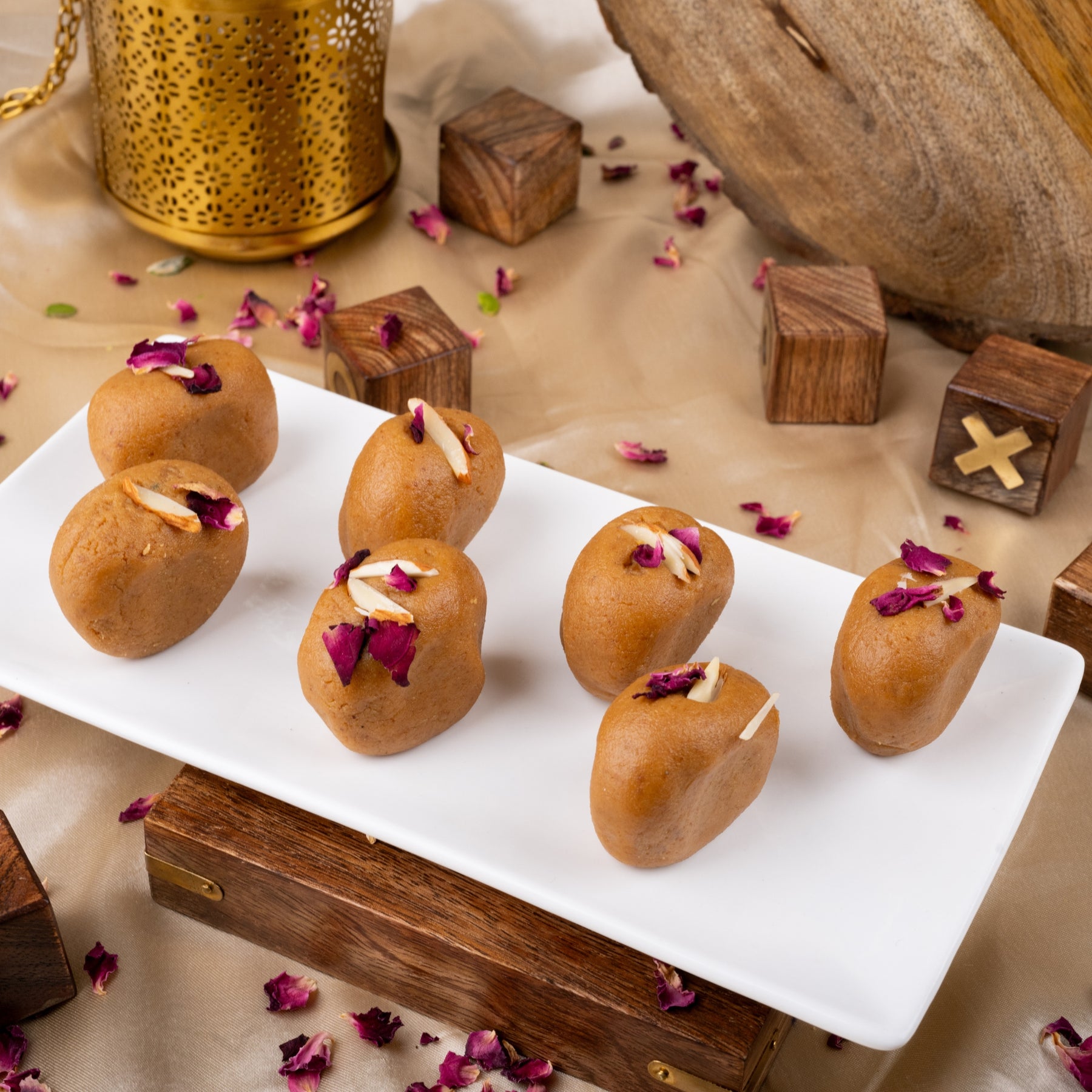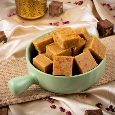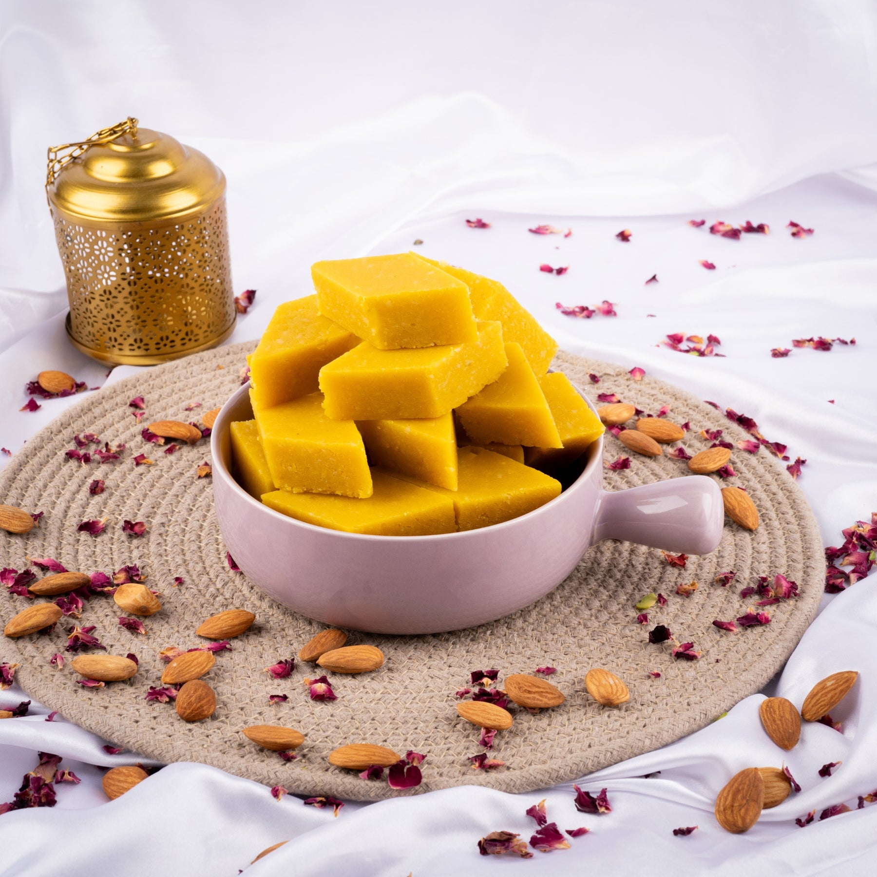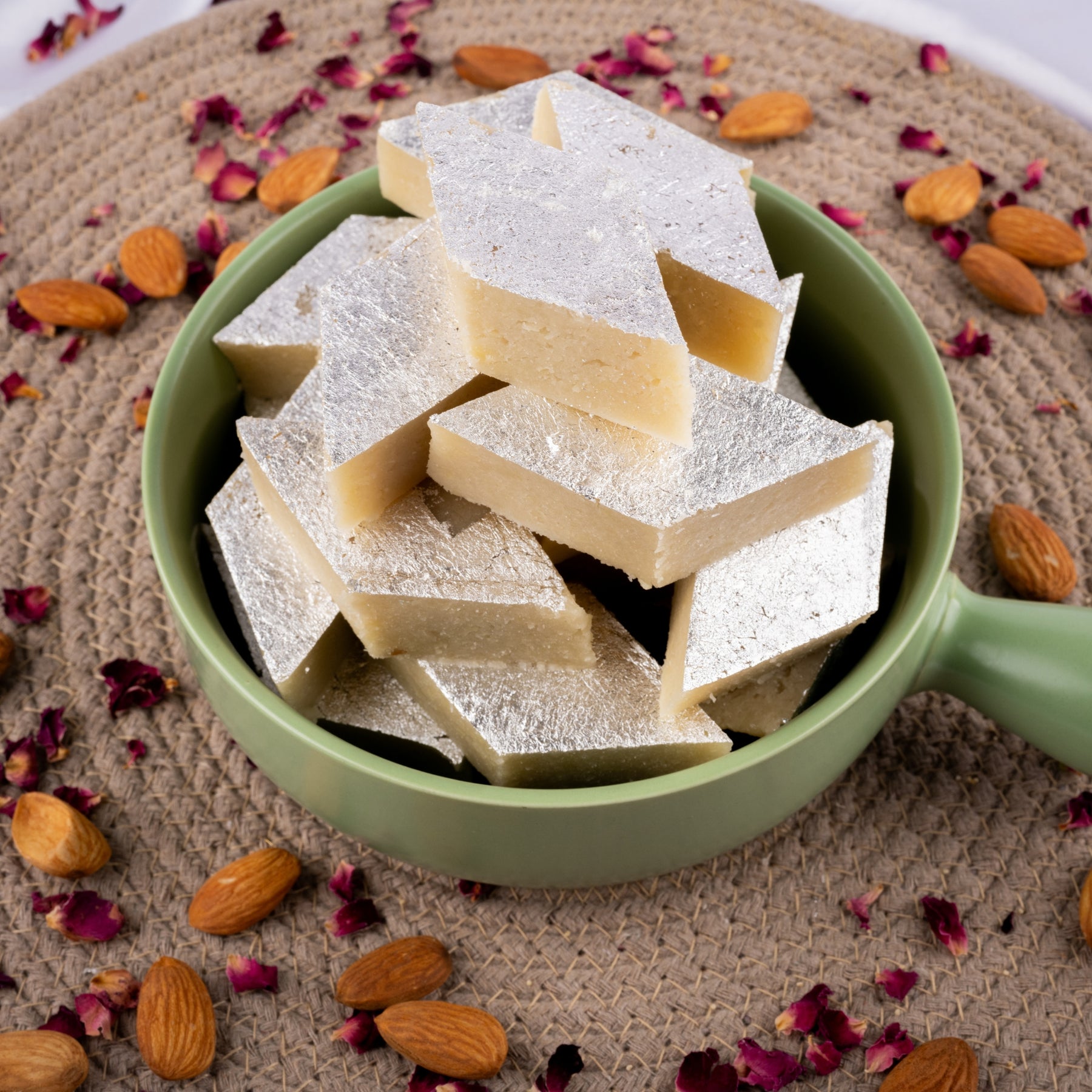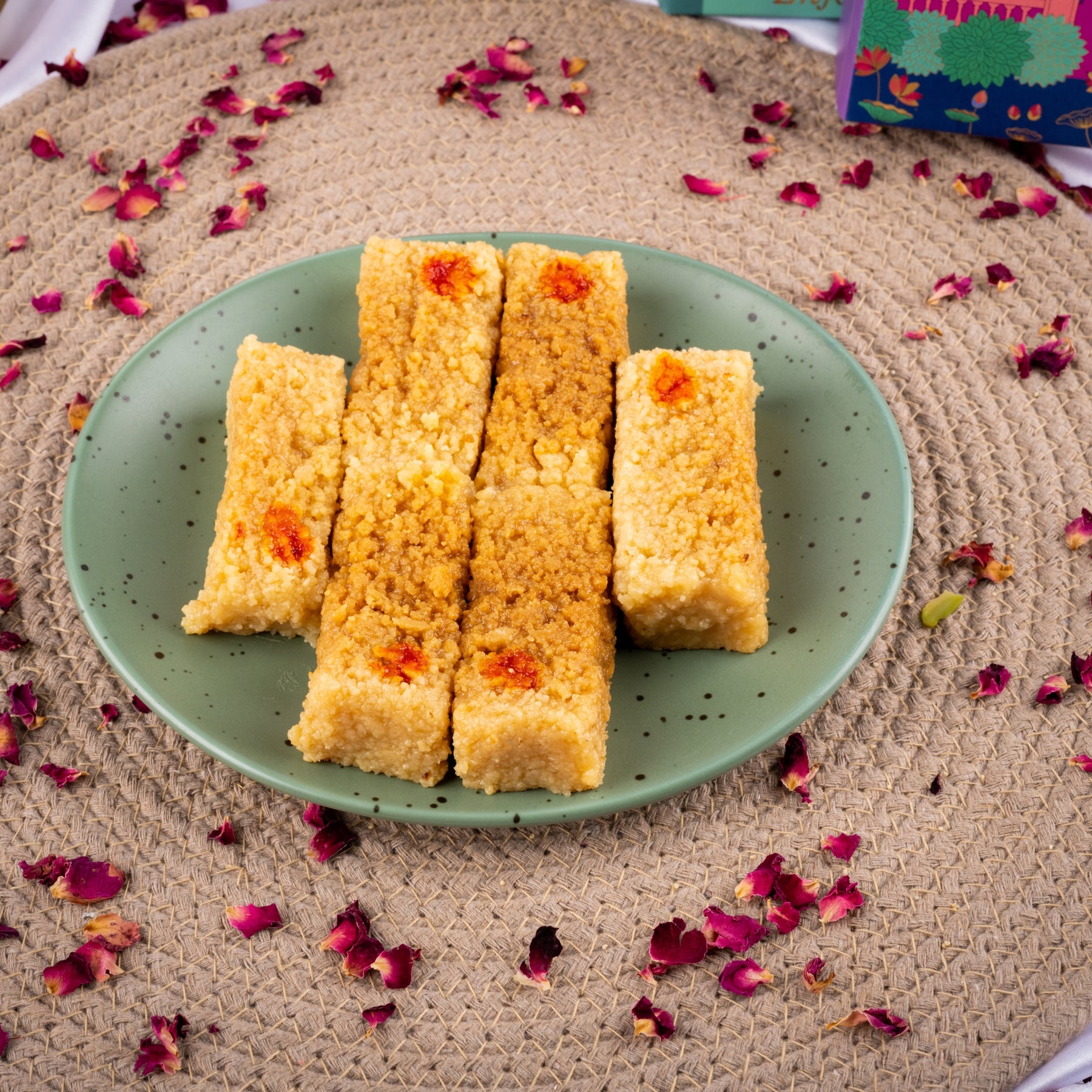 Kesar Badam Katli – A rich, saffron-infused delight made with premium almonds and the natural goodness of kesar. Free from refined sugar, milk powder, mawa, and artificial colors – just pure, golden indulgence in every bite.