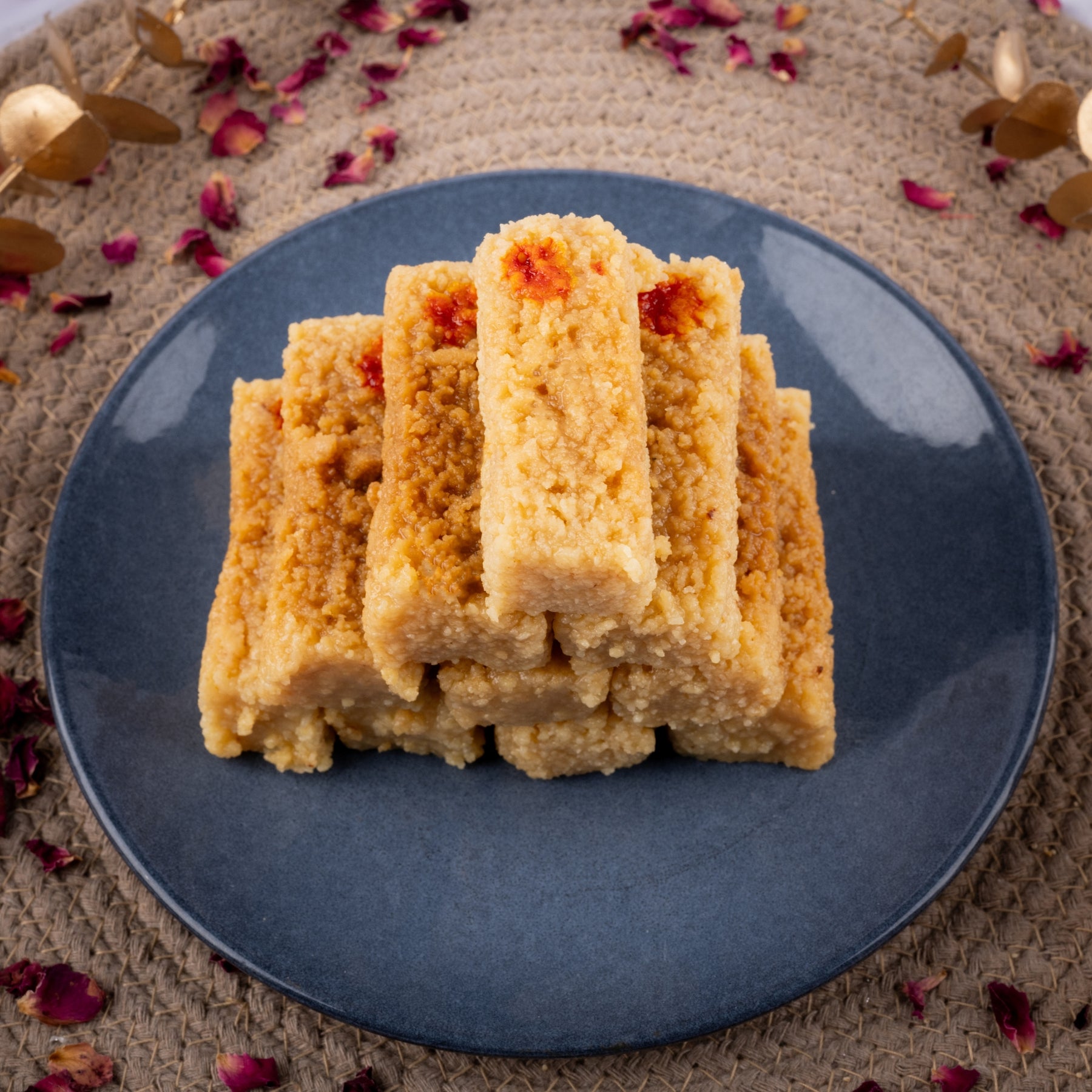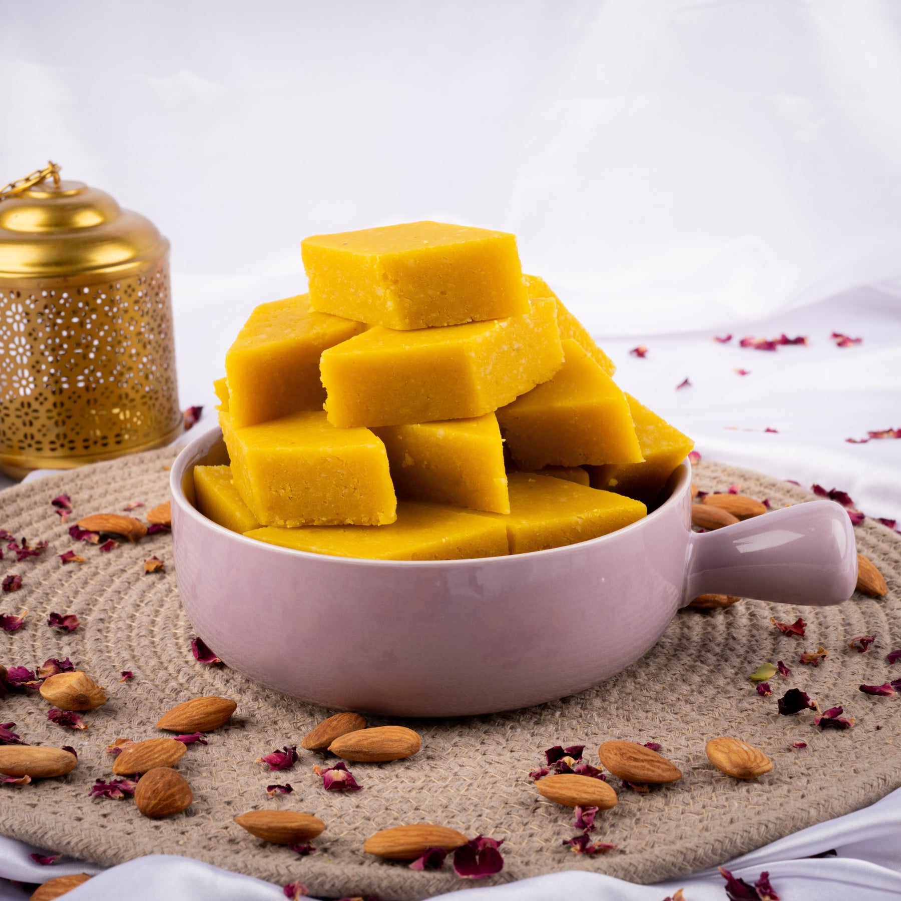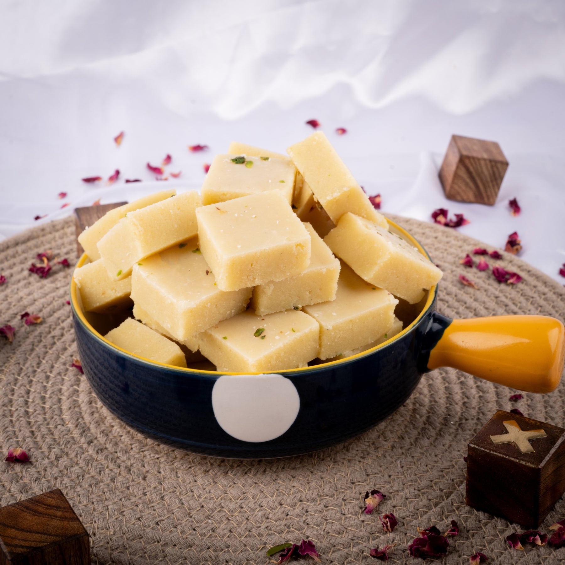 Our Premium Besan Barfi is a traditional Indian sweet made with roasted gram flour, homemade mawa, pure desi ghee, and sweetened with natural mishri. Handcrafted in small batches, it carries a rich nutty flavor with a soft, grainy texture that melts in the mouth. Free from refined sugar and additives, it’s a wholesome treat for both kids and adults. Perfect for festivals, weddings, corporate gifts, or everyday indulgence, this beautifully packed mithai box brings together tradition, taste, and health in every bite.