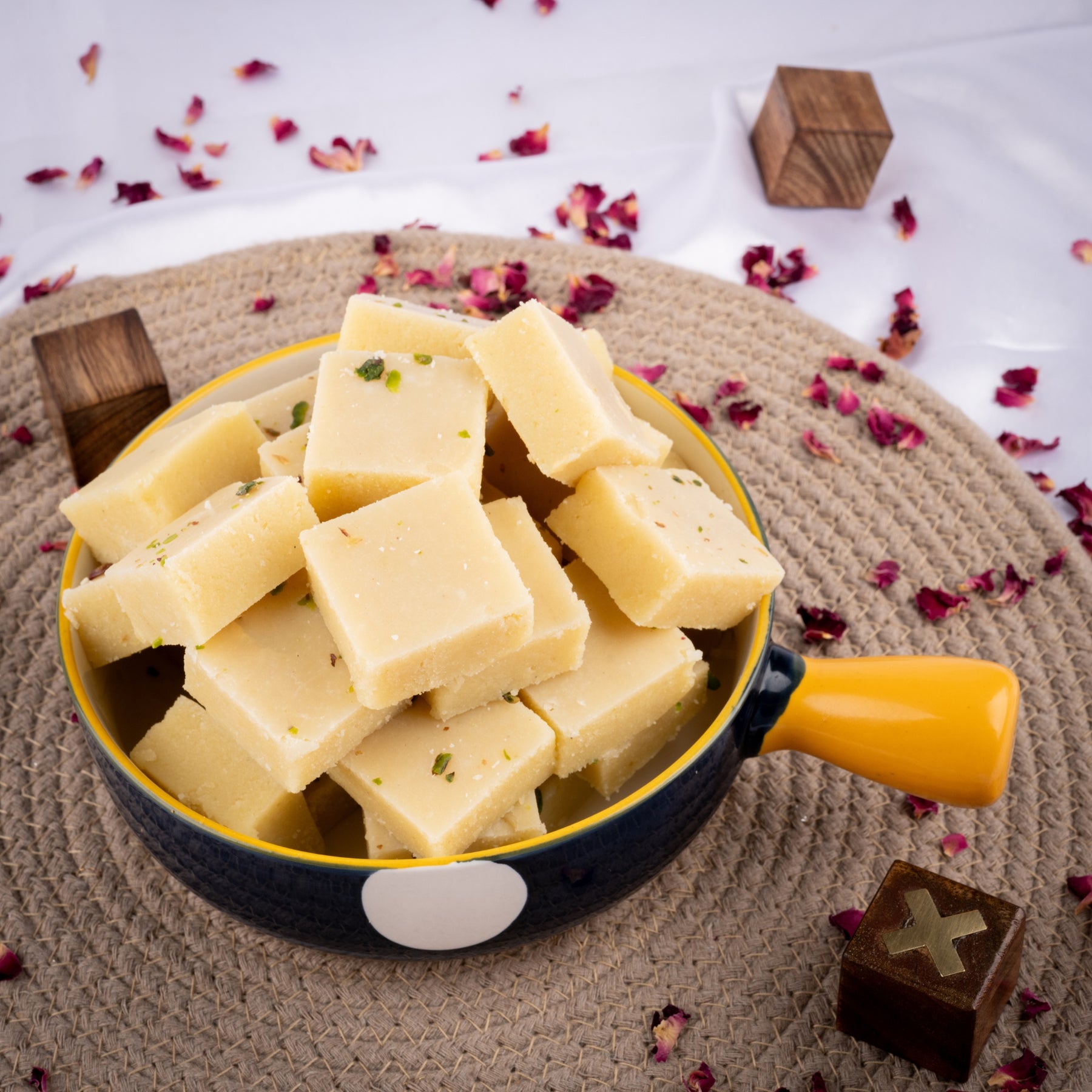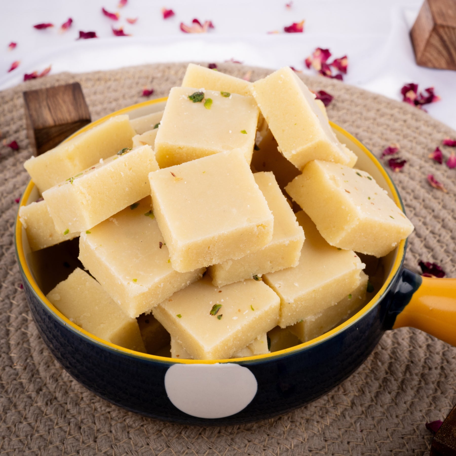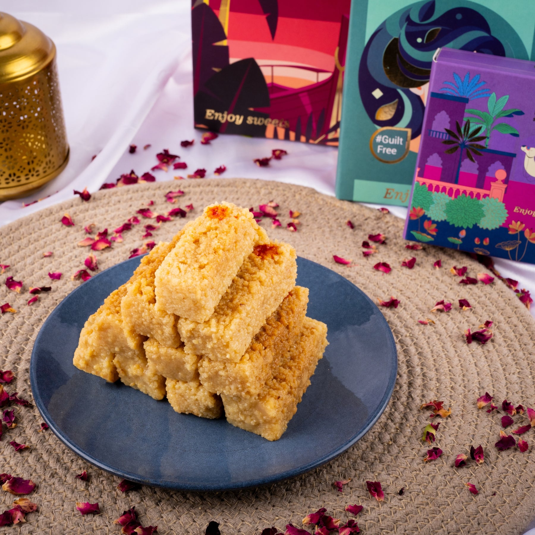 Our Premium Besan Barfi is a traditional Indian sweet made with roasted gram flour, homemade mawa, pure desi ghee, and sweetened with natural mishri. Handcrafted in small batches, it carries a rich nutty flavor with a soft, grainy texture that melts in the mouth. Free from refined sugar and additives, it’s a wholesome treat for both kids and adults. Perfect for festivals, weddings, corporate gifts, or everyday indulgence, this beautifully packed mithai box brings together tradition, taste, and health in every bite.