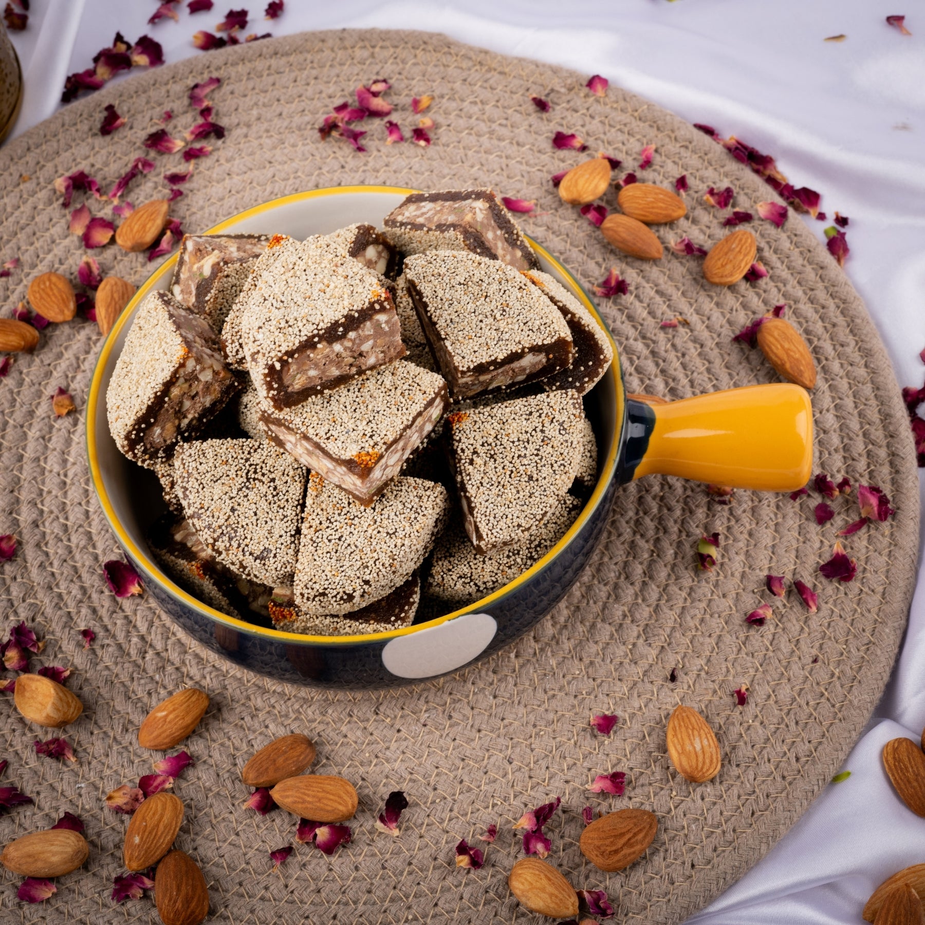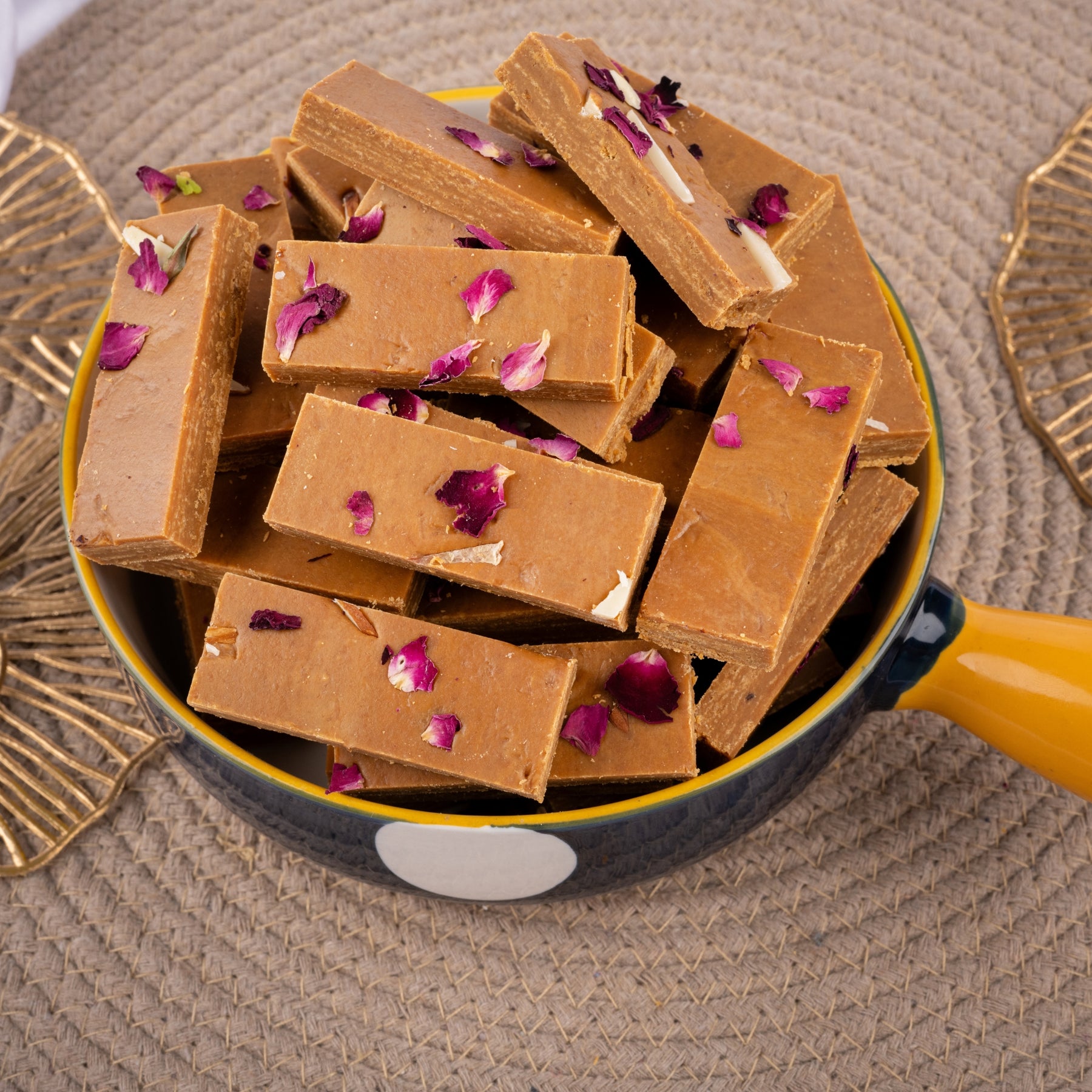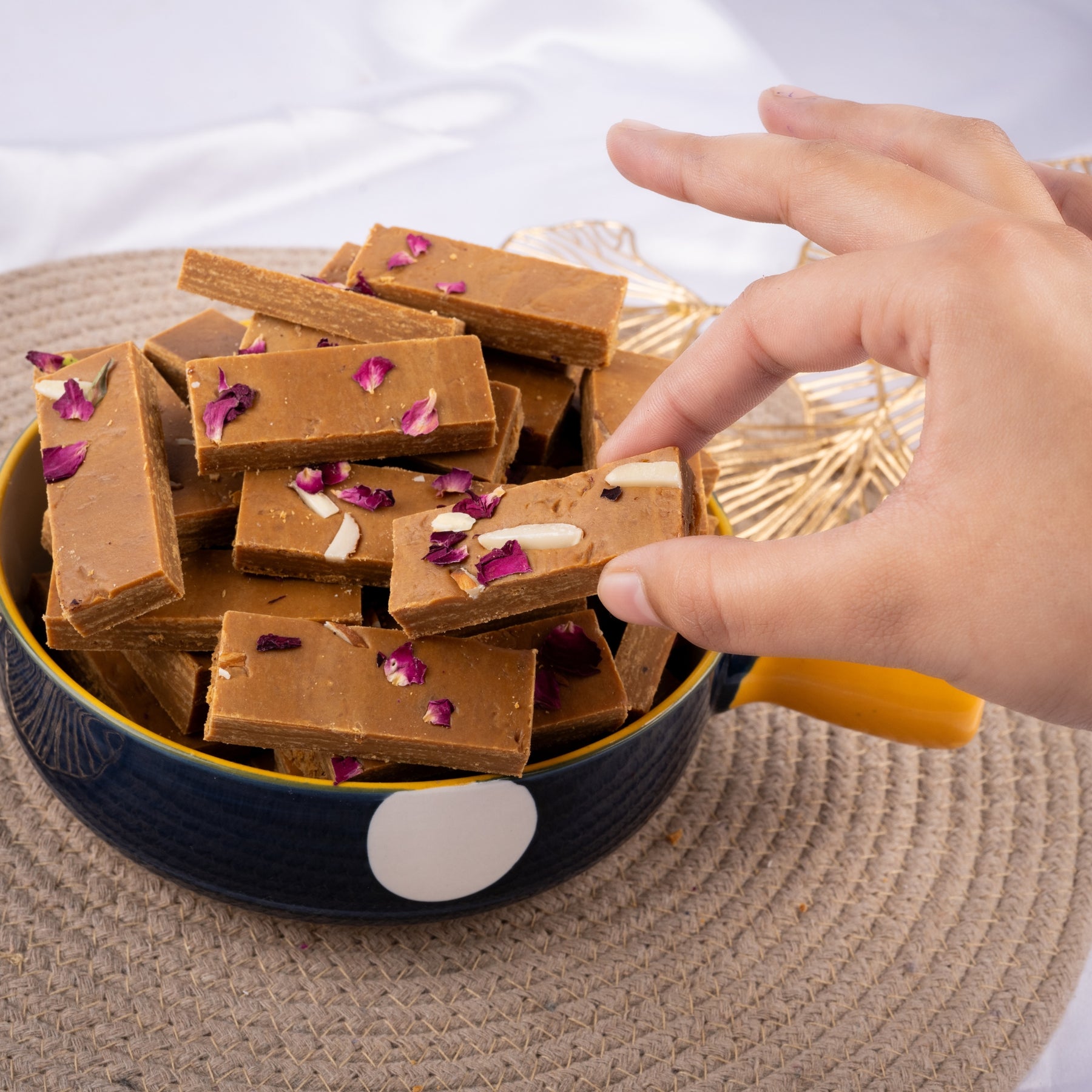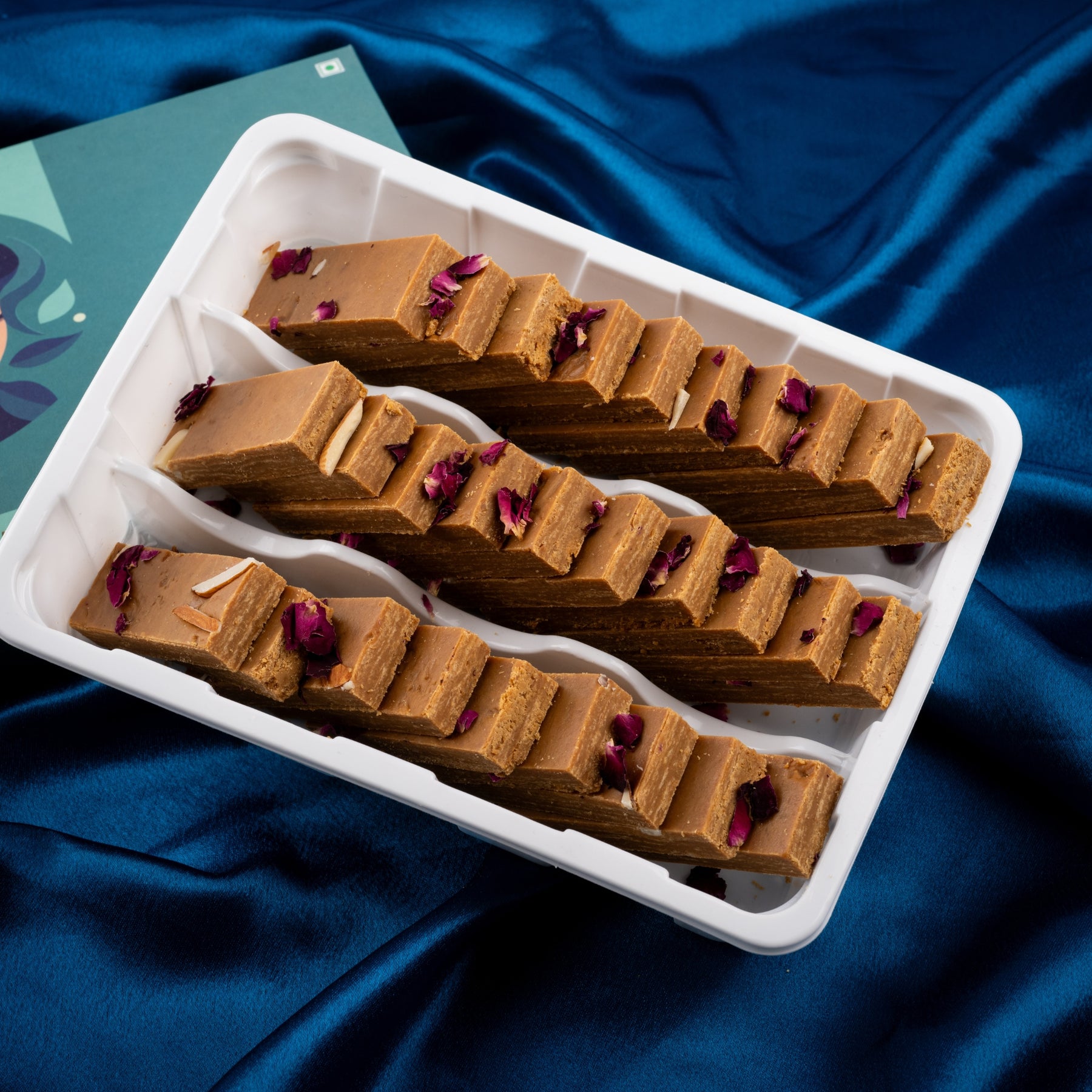 Gud Mishri's Roasted Barfi is a healthier, guilt-free take on classic Indian traditional sweets. Sweetened with natural Mishri instead of refined sugar, this barfi is made with premium ingredients to ensure the perfect balance of flavor and authenticity. Free from artificial food colors, it offers a pure, wholesome indulgence with every bite. Rich in taste and packed with tradition, this roasted barfi is perfect for gifting during festivals or special occasions. Whether you're treating yourself or sharing with loved ones, Gud Mishri Roasted Barfi is a delightful, healthier alternative to satisfy your sweet cravings.