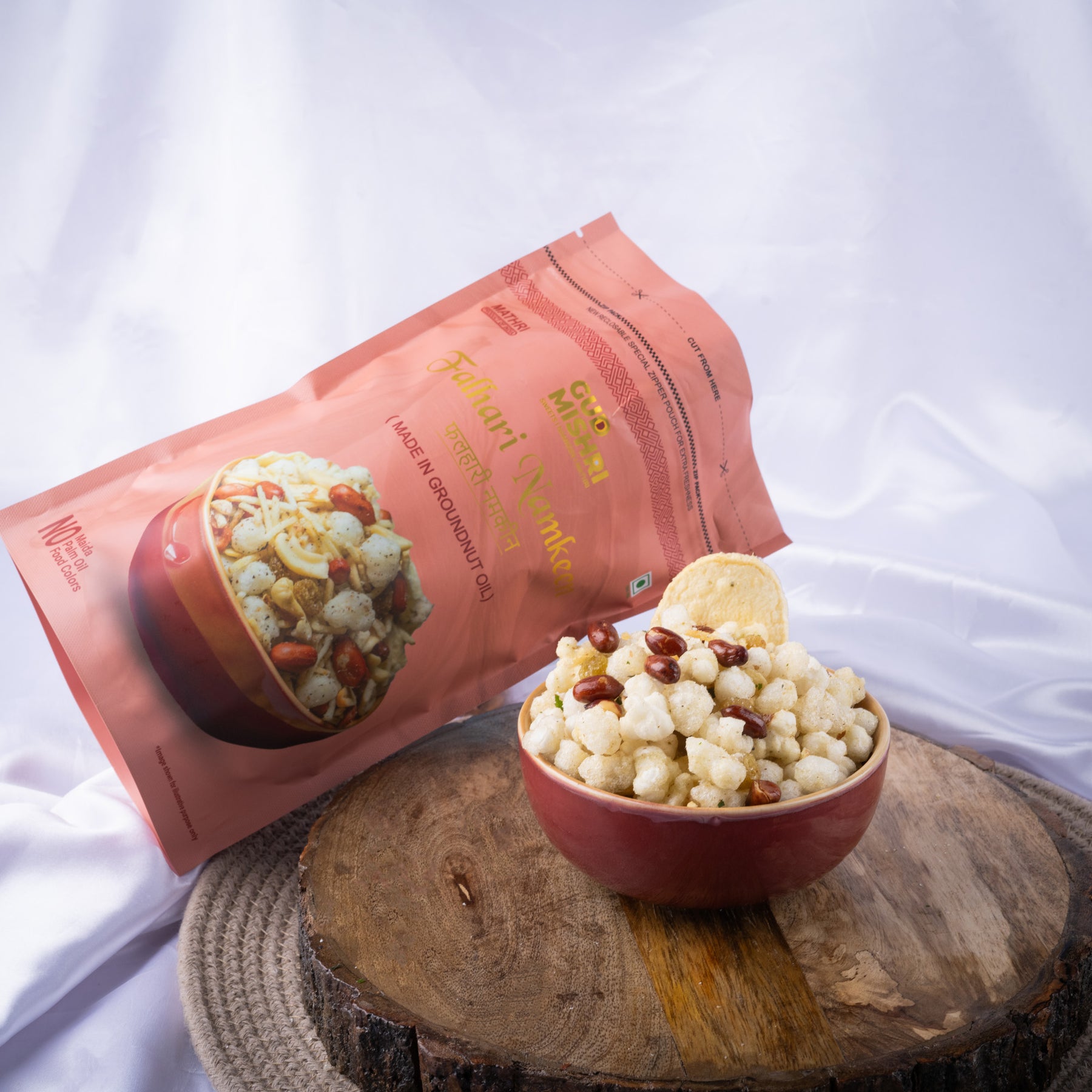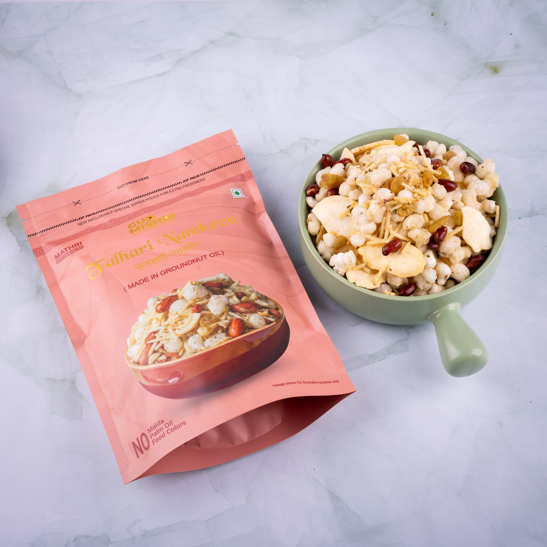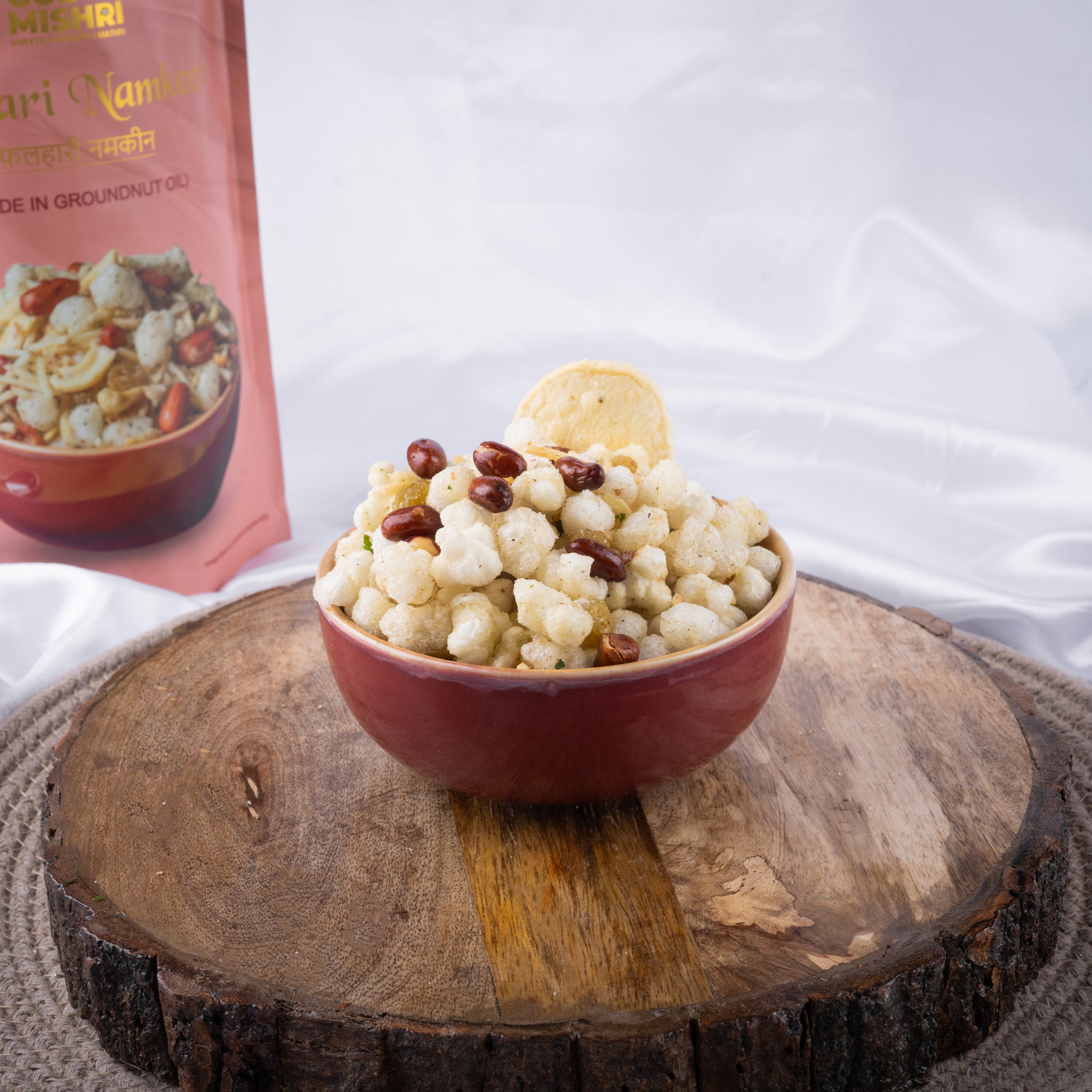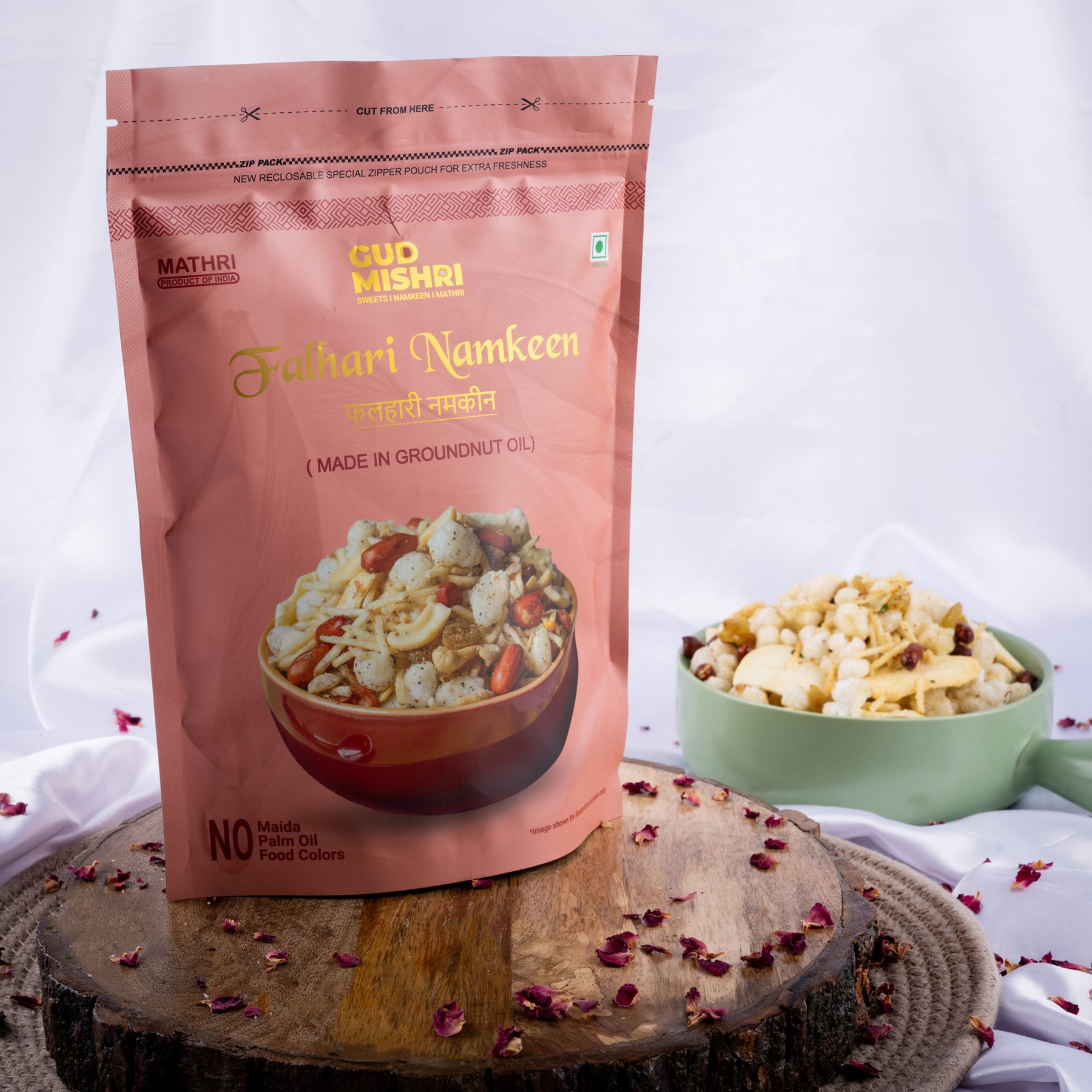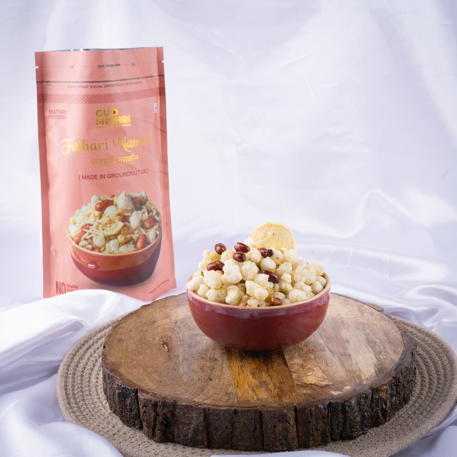 Gud Mishri Falahari Mixture (400g) – Satisfy your snack cravings with the Gud Mishri Falahari Mixture, a delightful and crunchy treat made from a blend of gram flour, water chestnut flour, tapioca pearls, peanuts, buckwheat flour, and fox nuts. This Traditional Falahari Mixture Namkeen is seasoned with aromatic curry leaves, coriander powder, and a mix of spices like dry mango powder, chili powder, black salt, and black pepper, delivering a perfect balance of Savory and spicy Flavors.