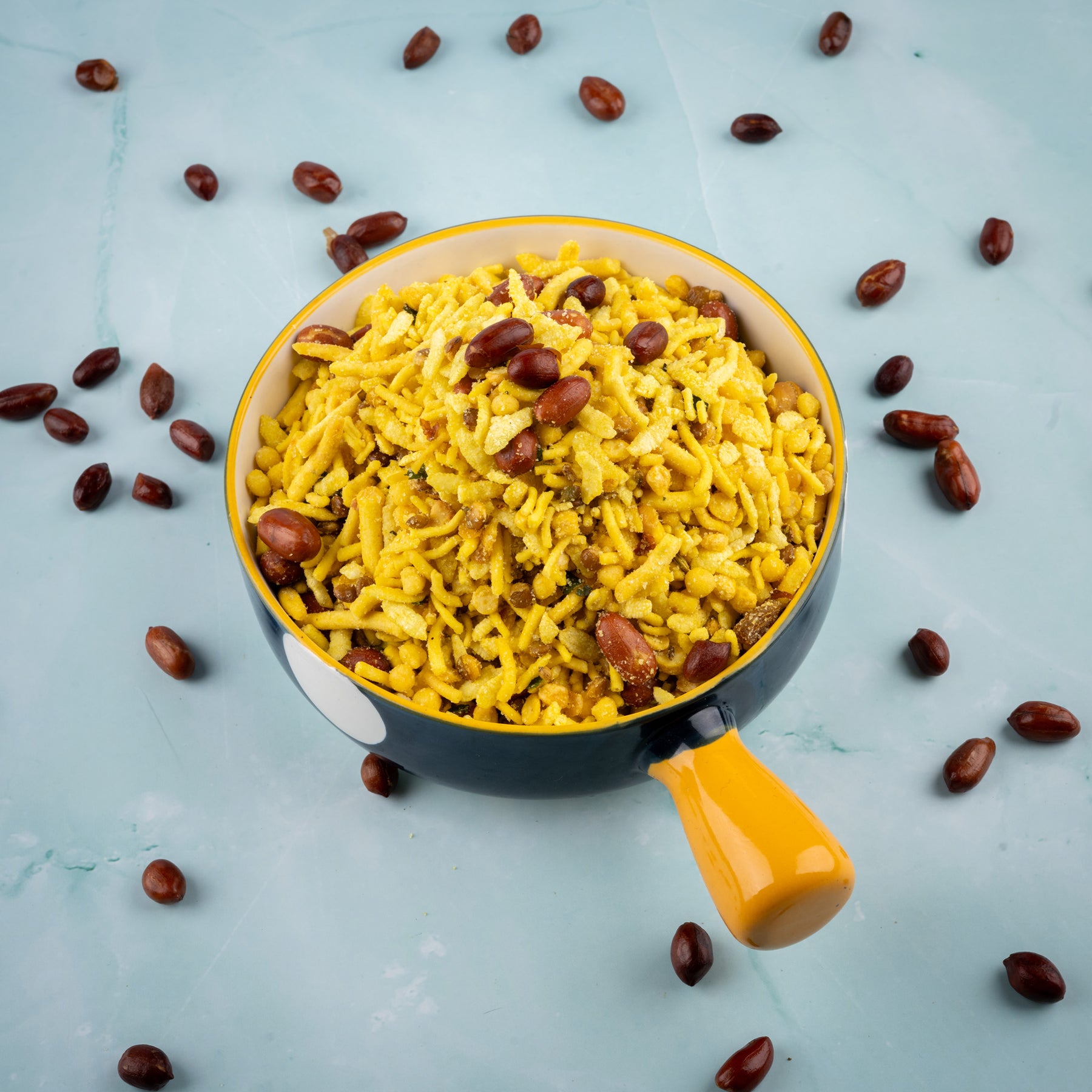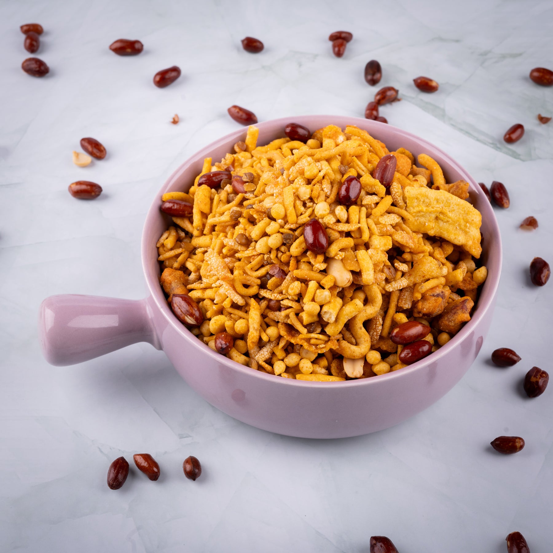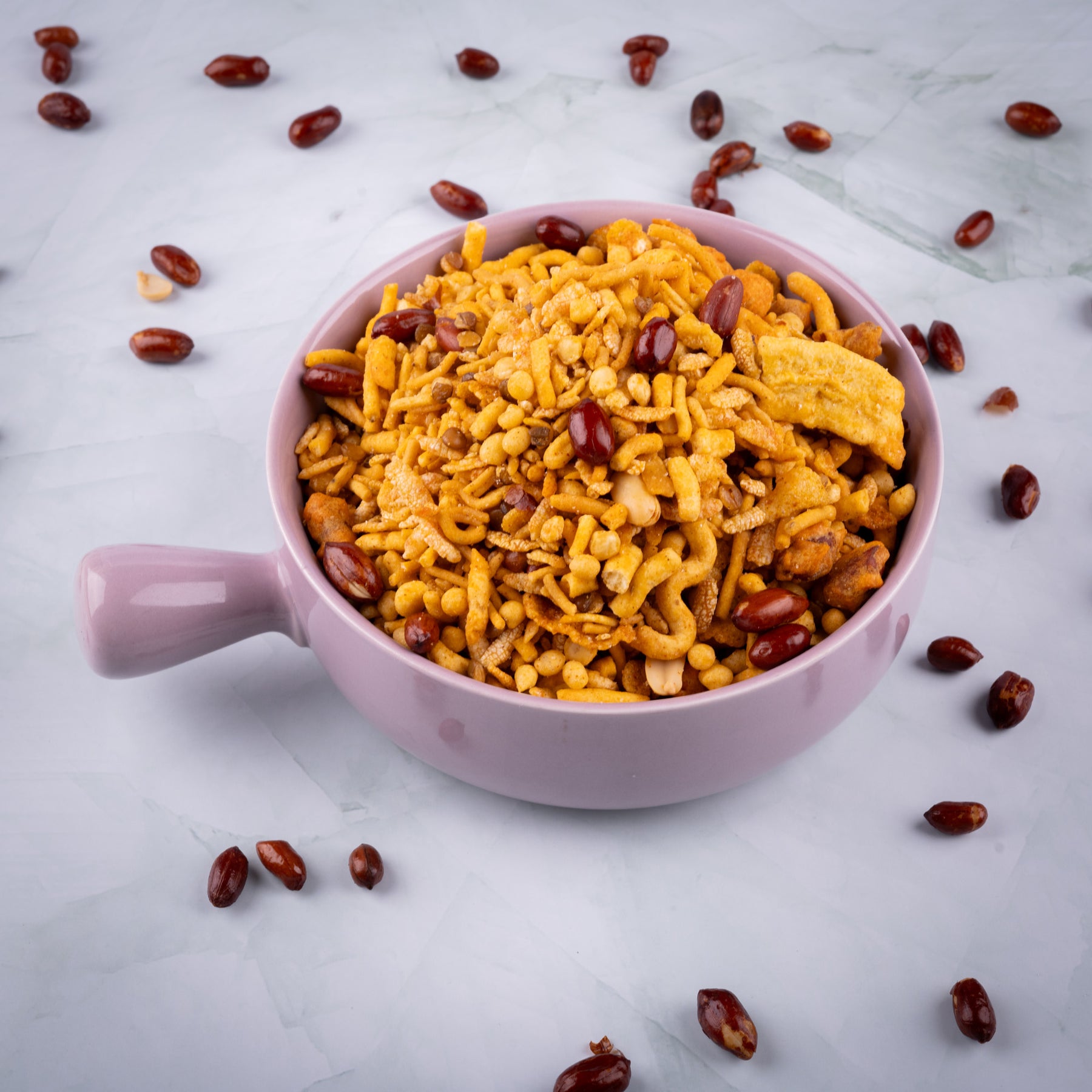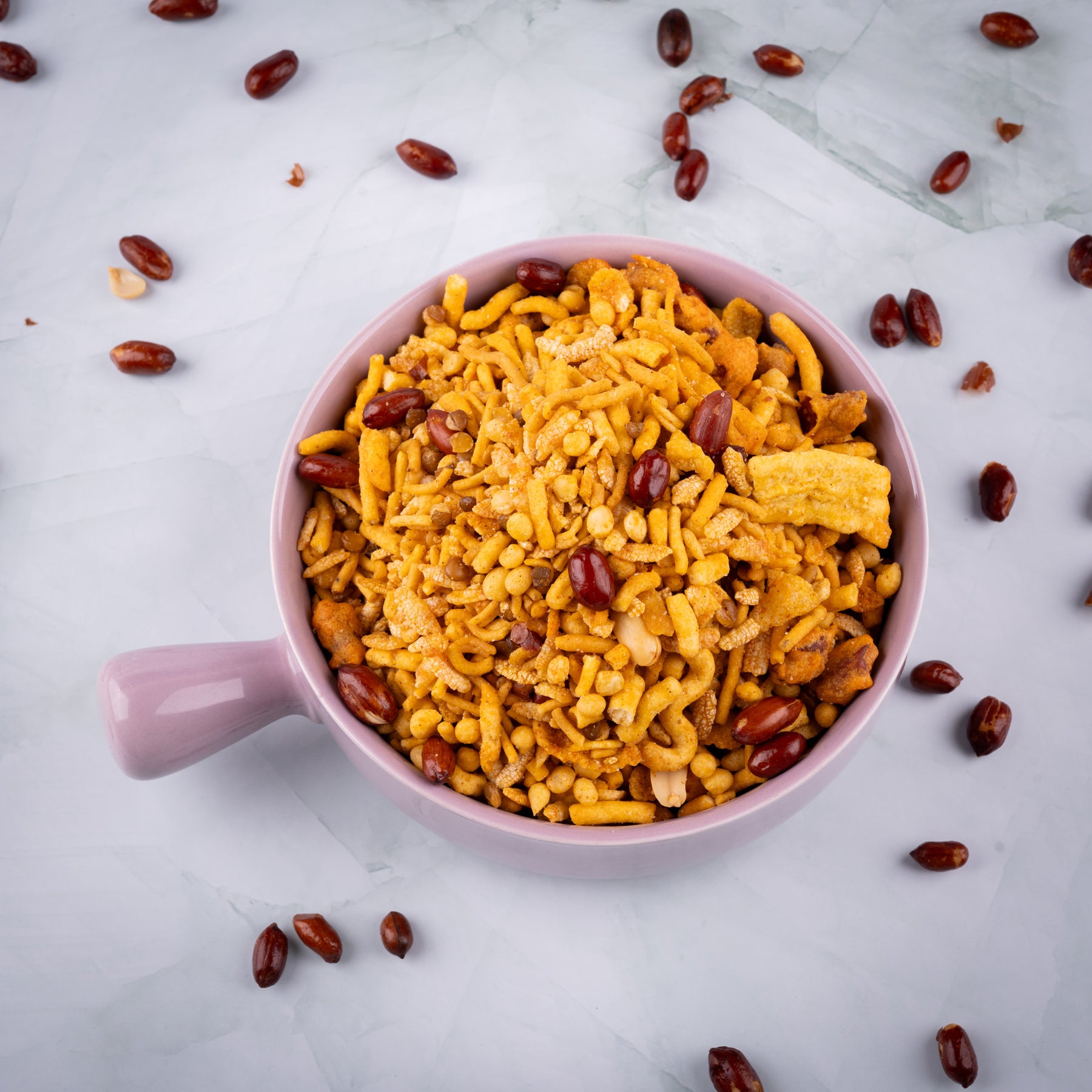 Mixture Namkeen, made with gram flour and cooked in groundnut oil for a wholesome, satisfying snack. Infused with a blend of carom seeds, chili powder, black salt, and dry mango powder, this Traditional Namkeen is a flavourful treat that satisfies your snack cravings. The addition of black pepper, asafoetida, baking soda, and cumin water gives it an extra burst of flavour, while peanuts add a crunchy texture.