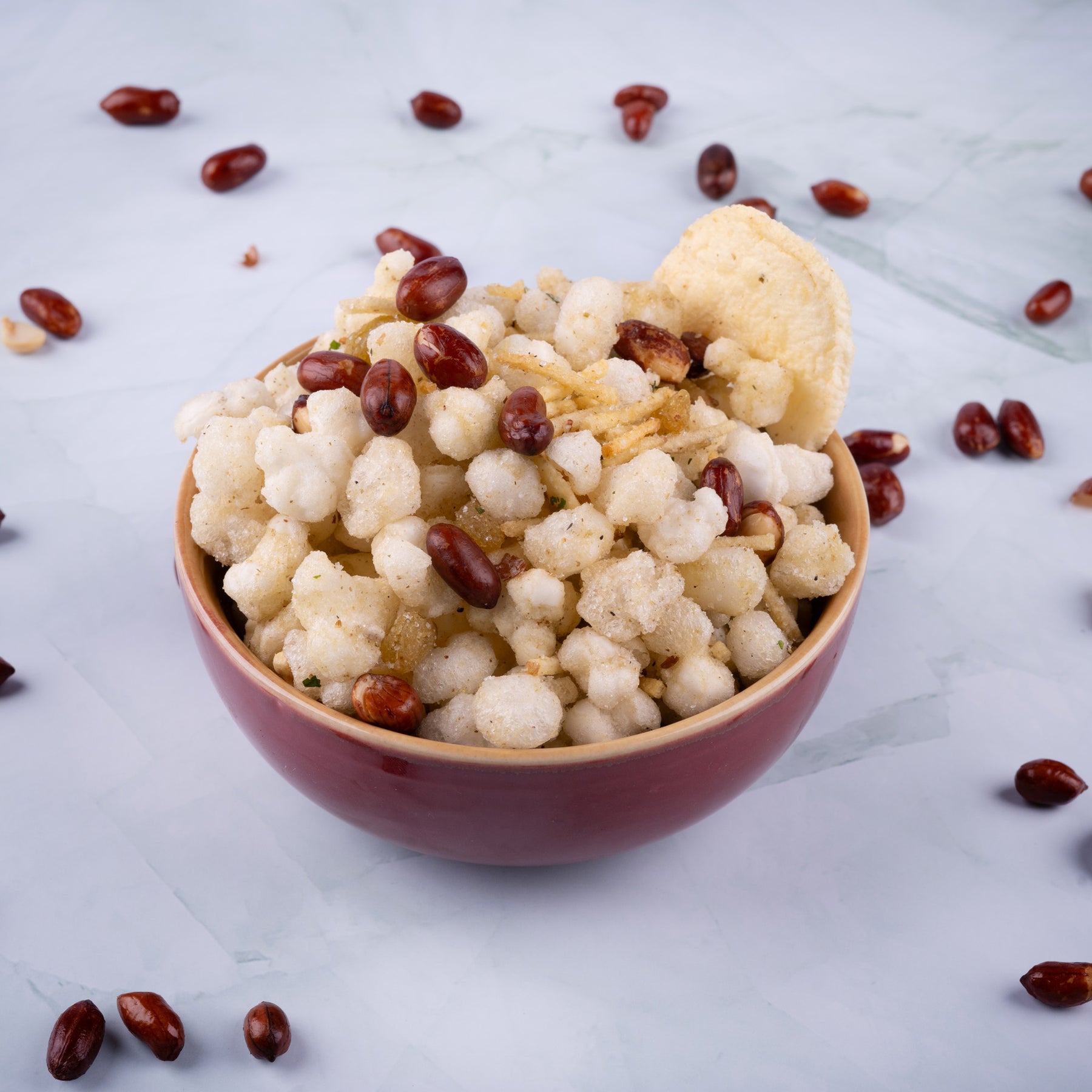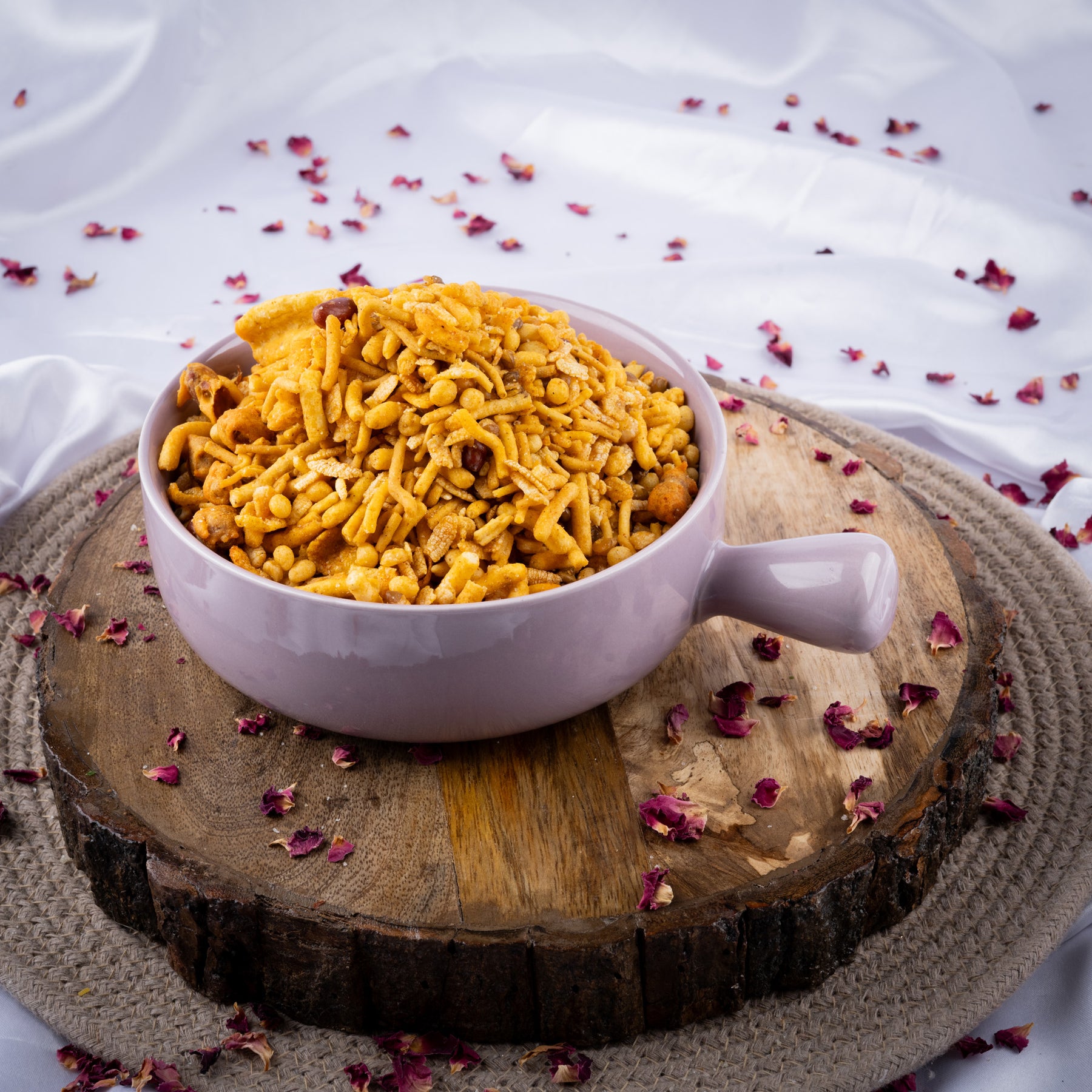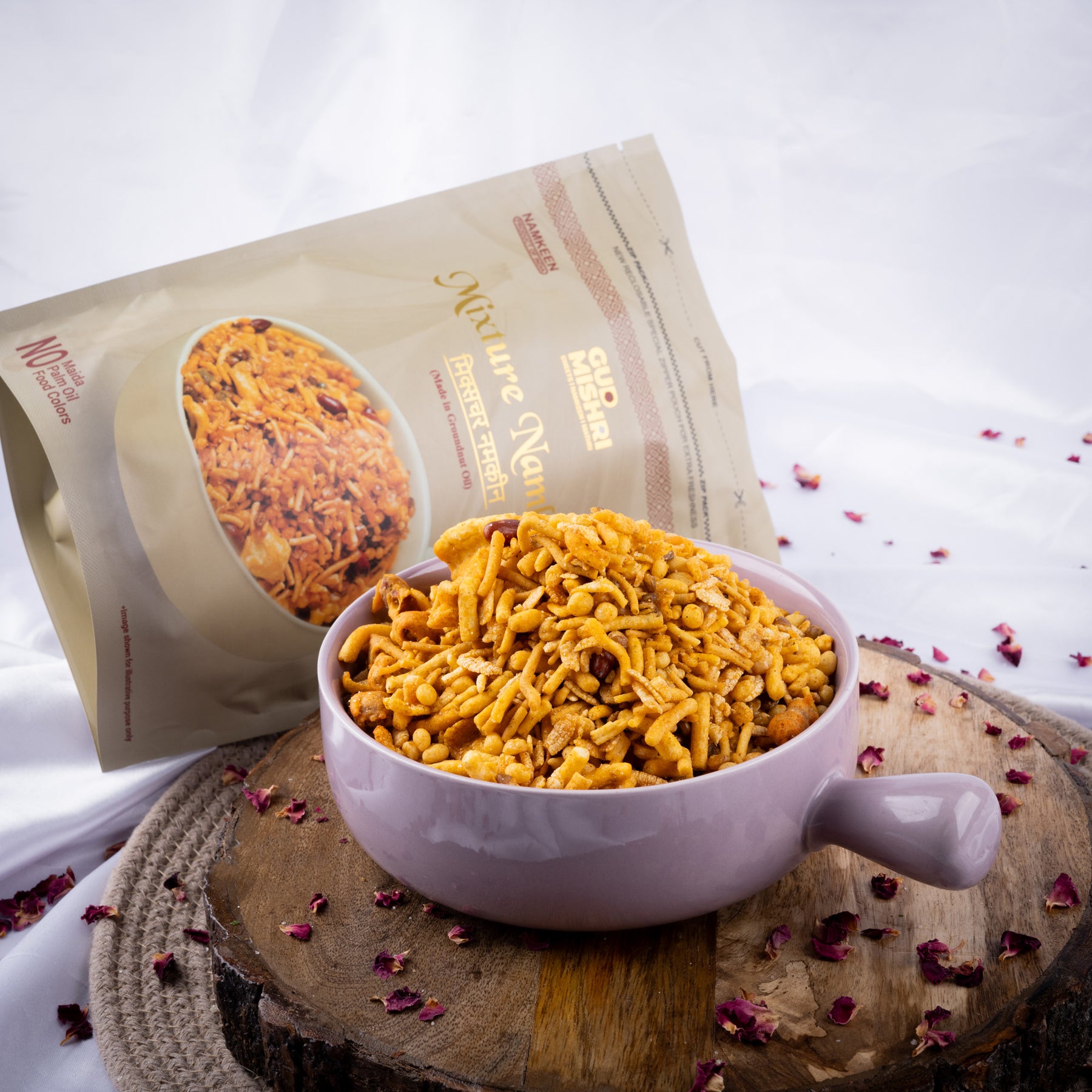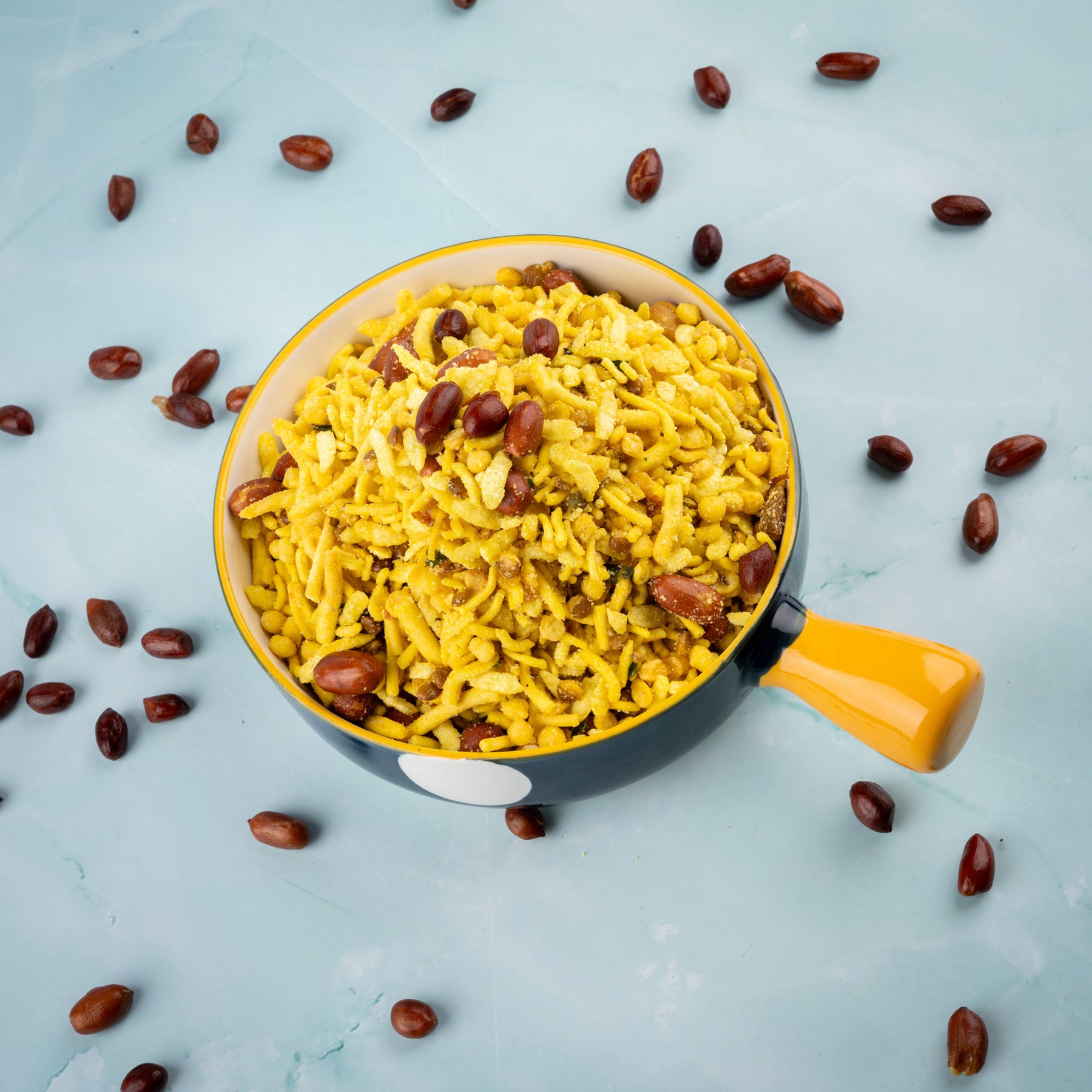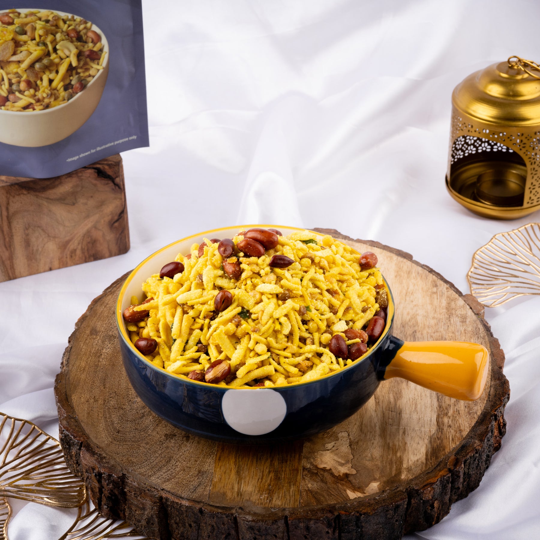 Mixture Namkeen, made with gram flour and cooked in groundnut oil for a wholesome, satisfying snack. Infused with a blend of carom seeds, chili powder, black salt, and dry mango powder, this Traditional Namkeen is a flavourful treat that satisfies your snack cravings. The addition of black pepper, asafoetida, baking soda, and cumin water gives it an extra burst of flavour, while peanuts add a crunchy texture.