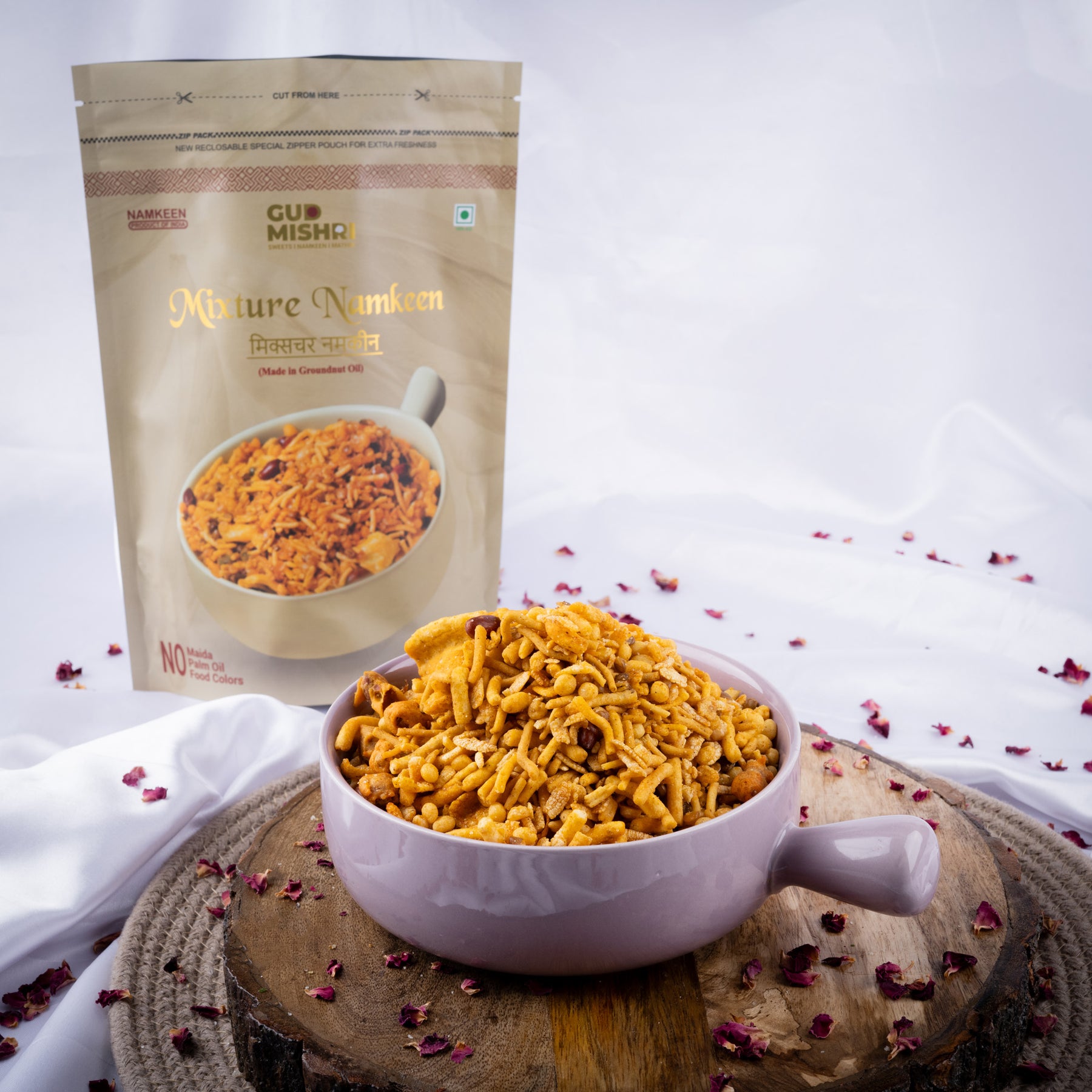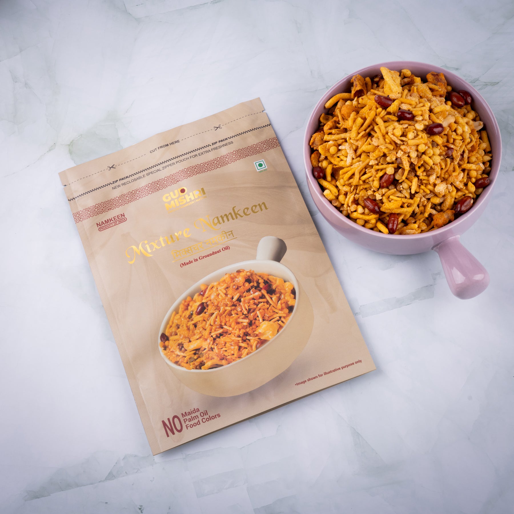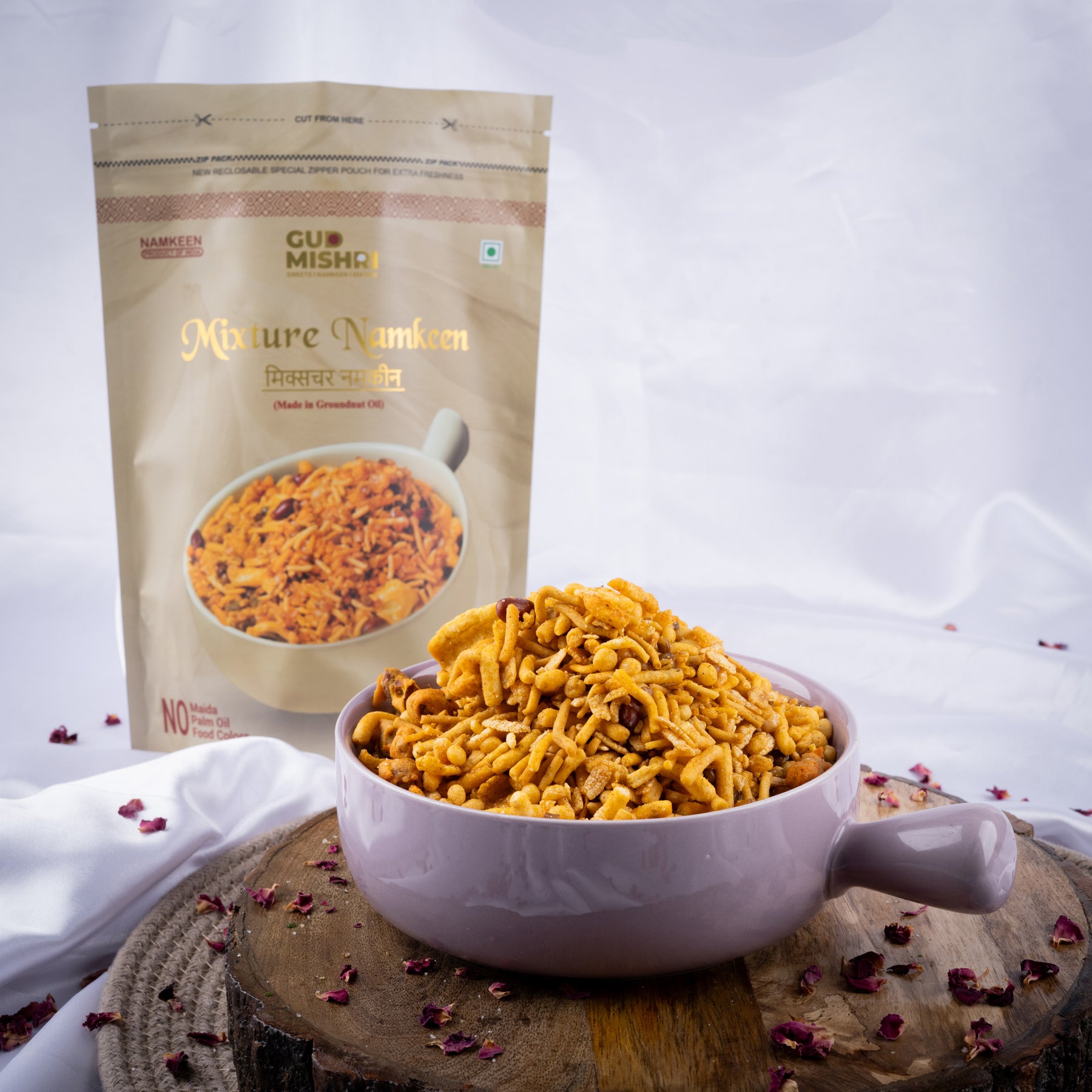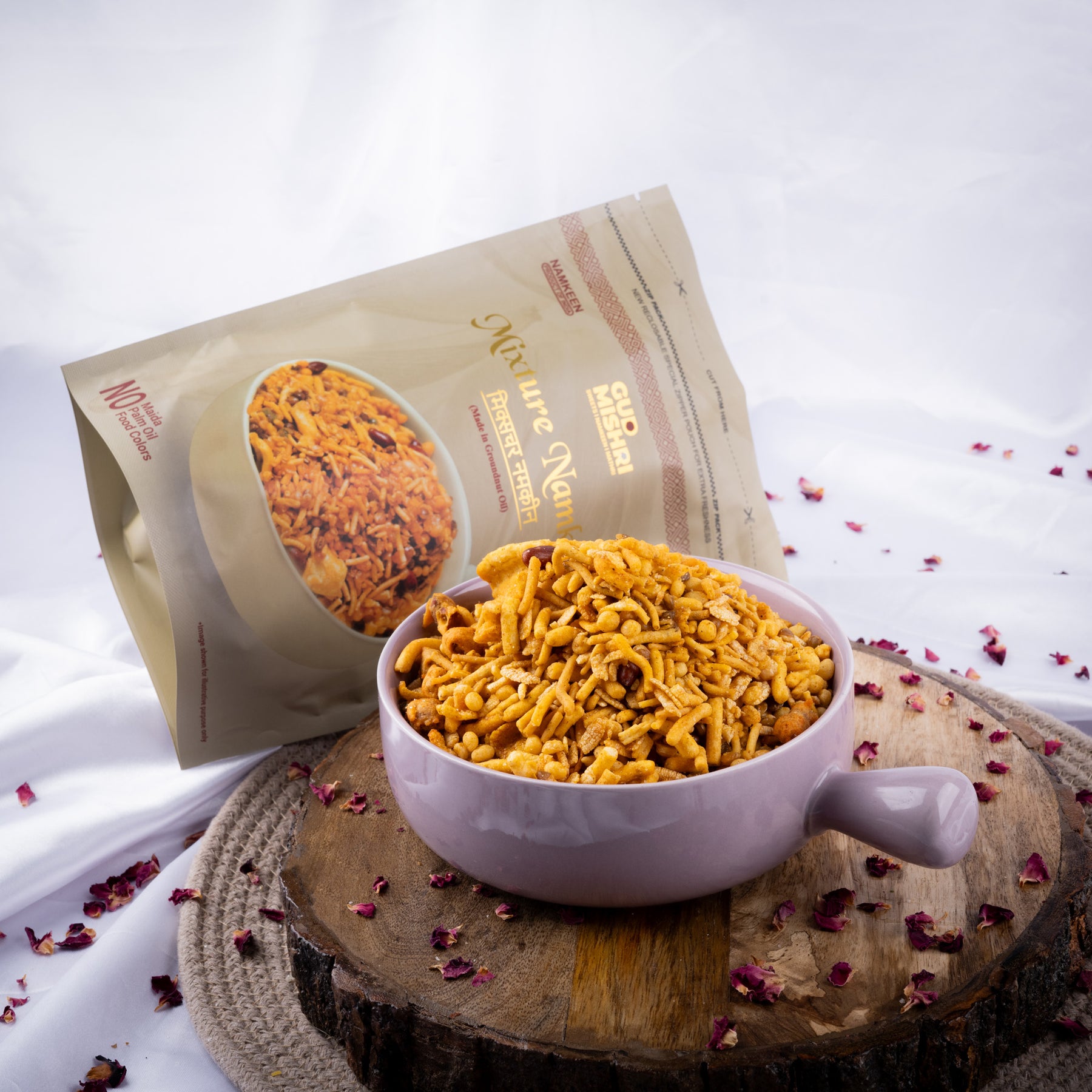 Mixture Namkeen, made with gram flour and cooked in groundnut oil for a wholesome, satisfying snack. Infused with a blend of carom seeds, chili powder, black salt, and dry mango powder, this Traditional Namkeen is a flavourful treat that satisfies your snack cravings. The addition of black pepper, asafoetida, baking soda, and cumin water gives it an extra burst of flavour, while peanuts add a crunchy texture.