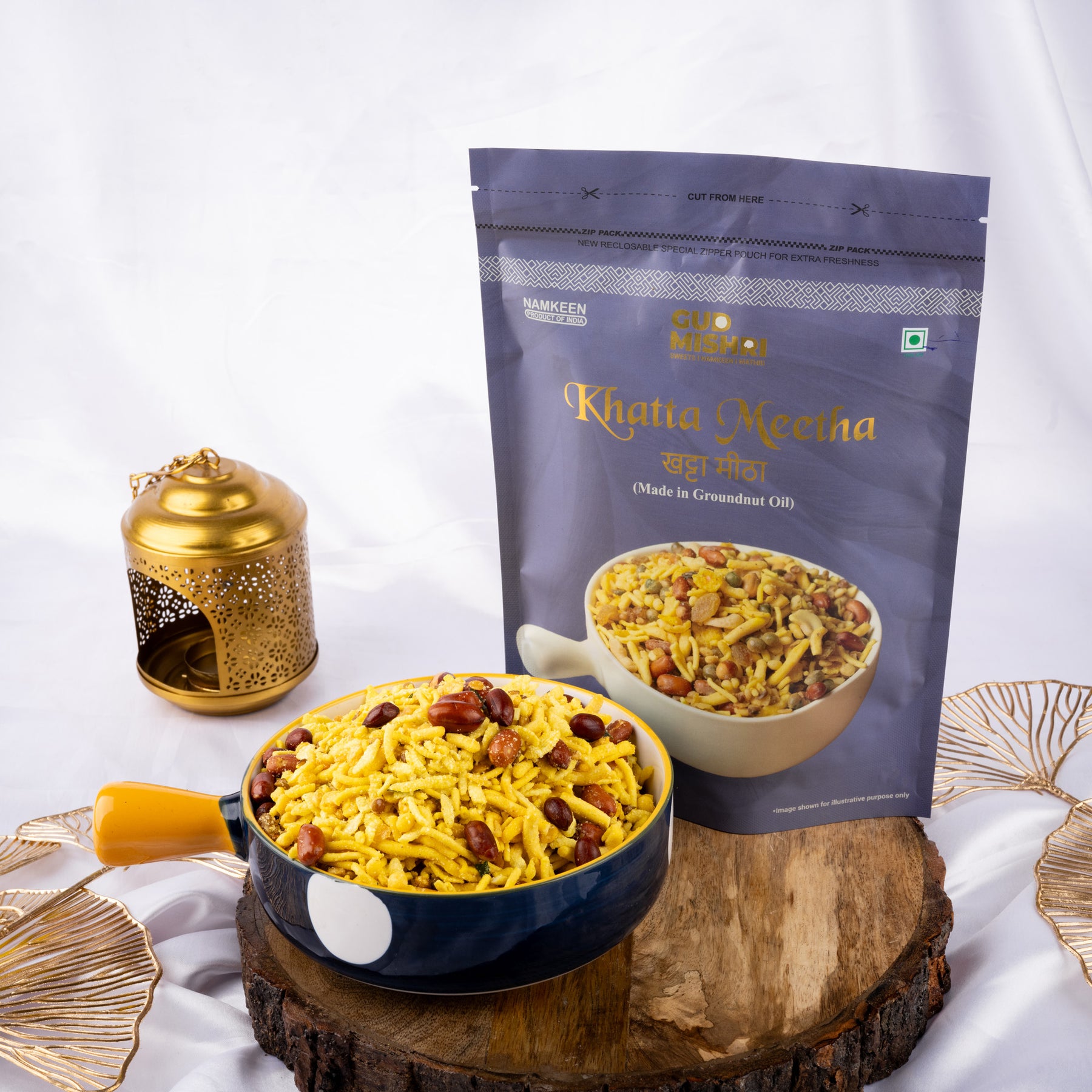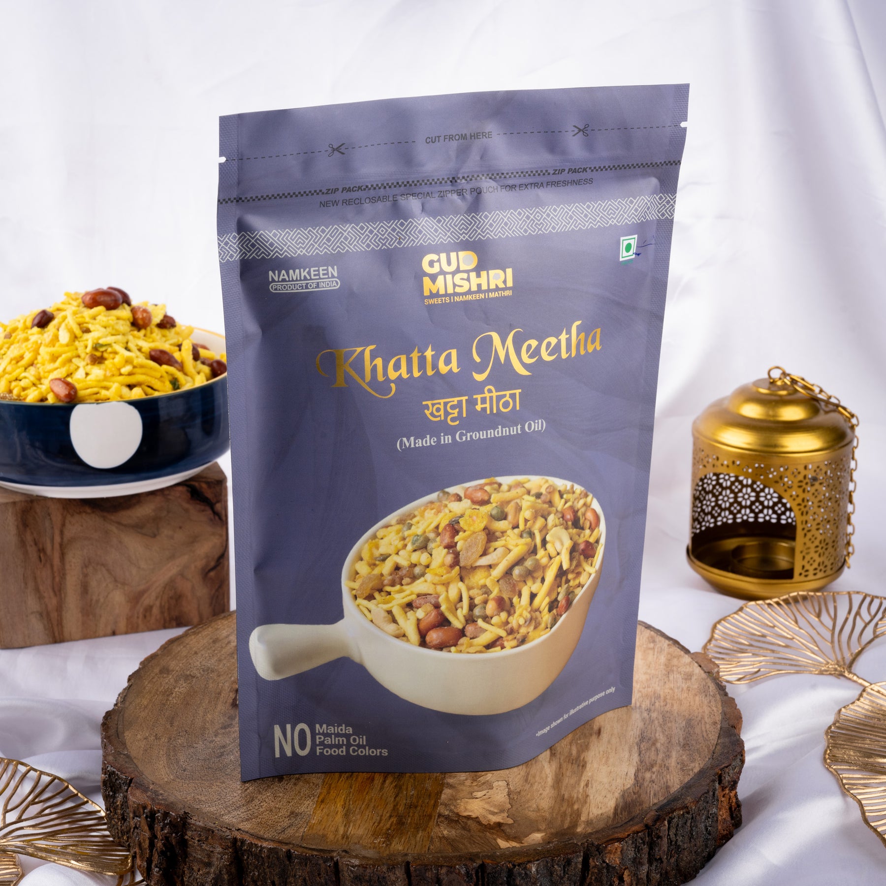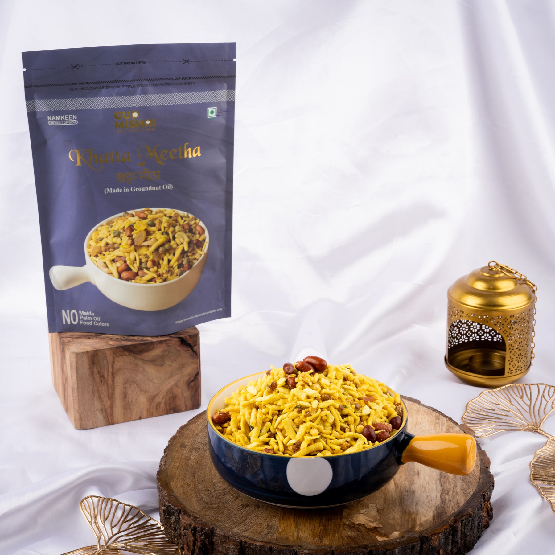 Gud Mishri Khatta-Meetha Namkeen (400g) – Delight in the perfect balance of sweet and tangy with Gud Mishri Khatta-Meetha Namkeen. Made from gram flour and premium spices like carom seeds, chili powder, black salt, dry mango powder, and black pepper, this delicious Traditional Khatta-Meetha Namkeen offers a unique, flavourful snack experience.