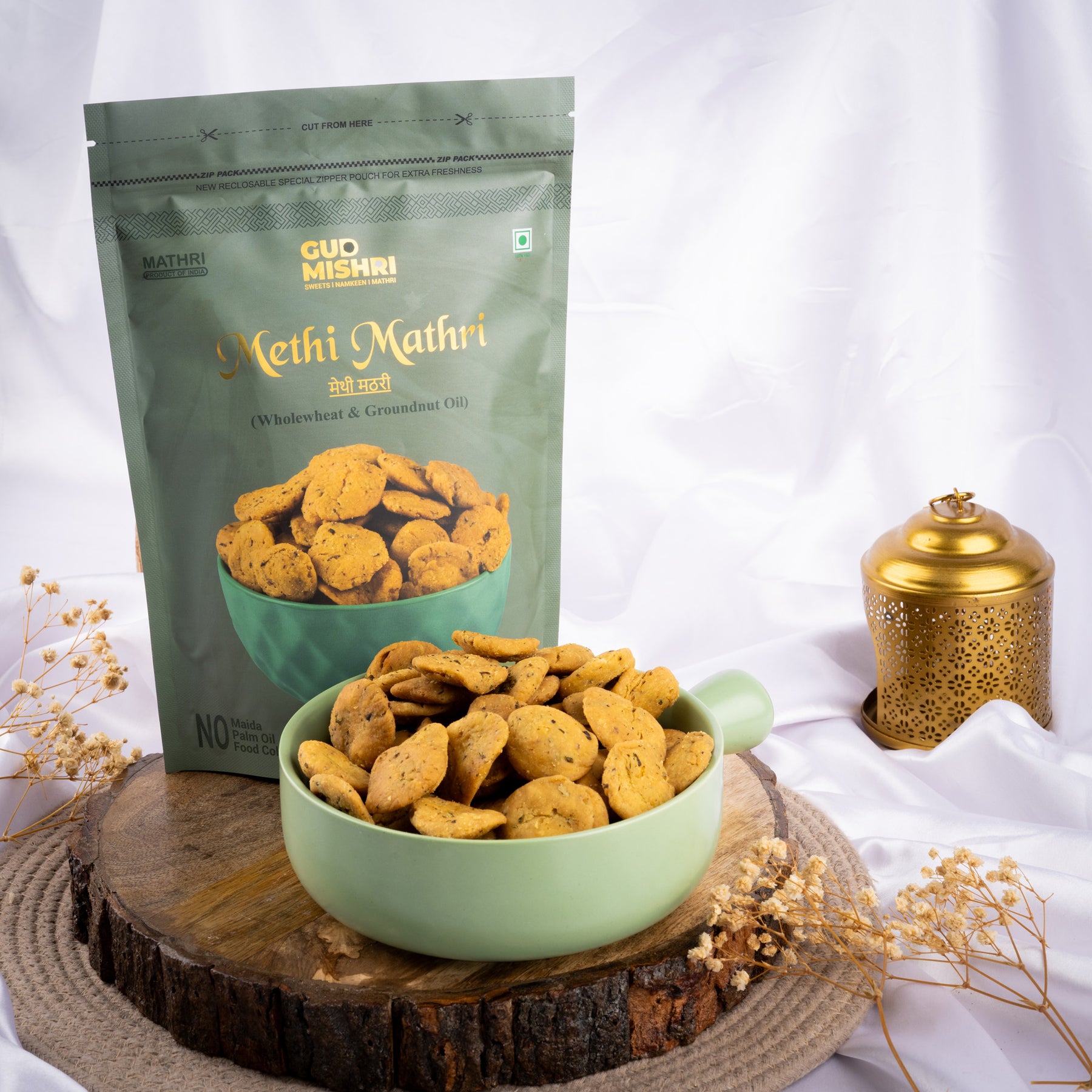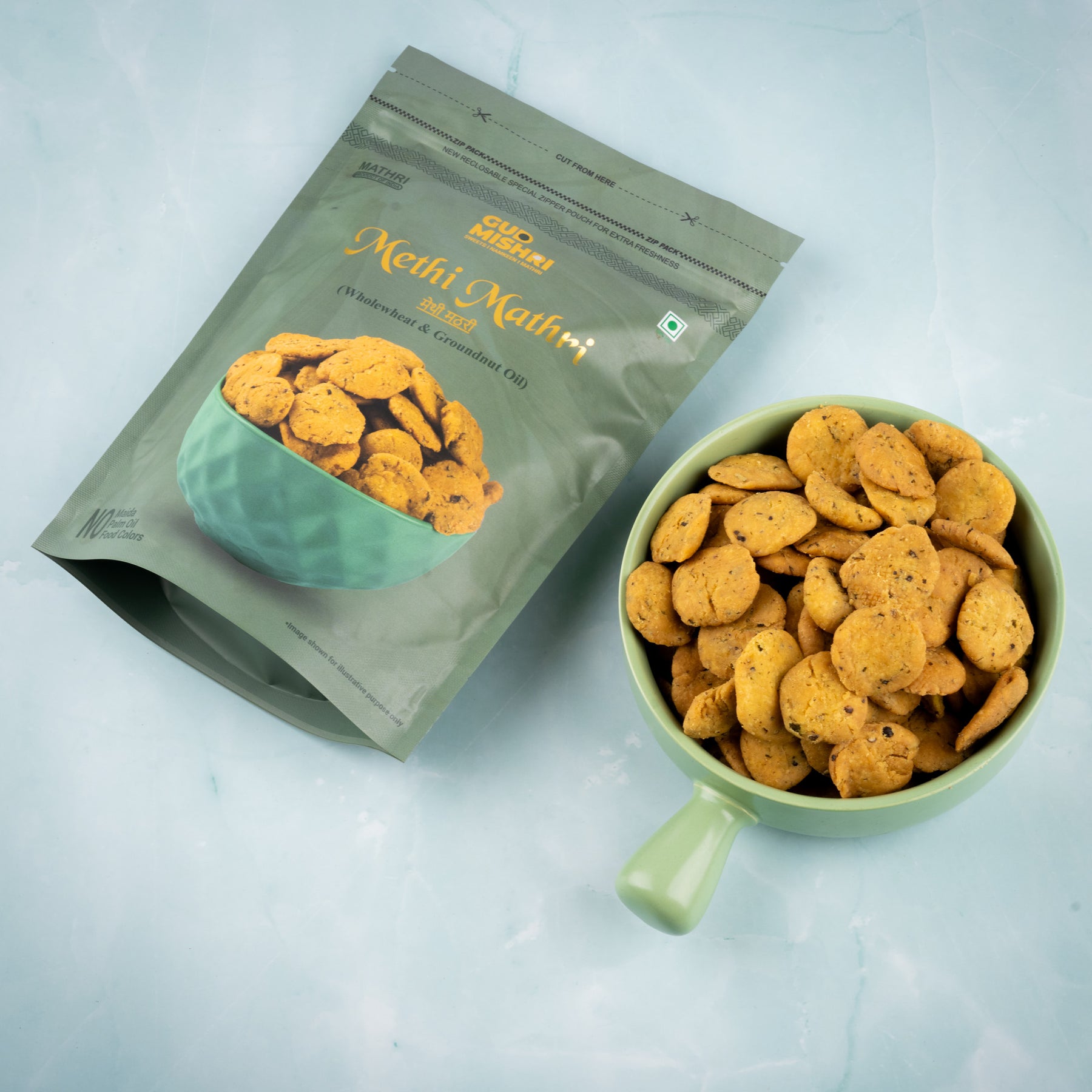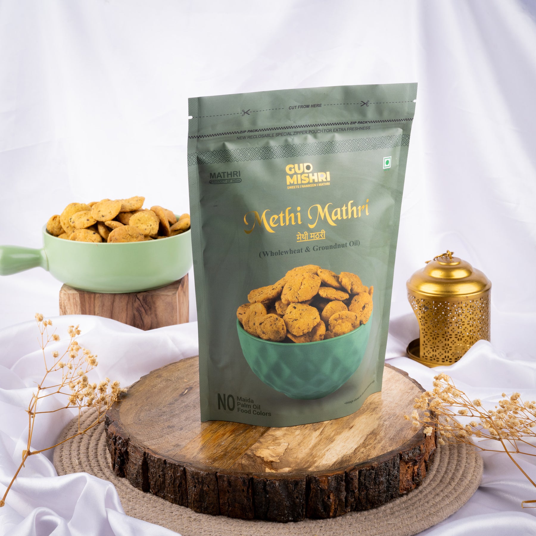 Infused with the goodness of Methi (fenugreek), these healthy mathri are not only delicious but also provide the health benefits of this nutritious herb. They’re the perfect choice for those looking for a guilt-free treat. Whether you’re craving a snack or a healthy tea time snack, Gud Mishri Methi Mathri makes the ideal choice for a crispy, satisfying snack.