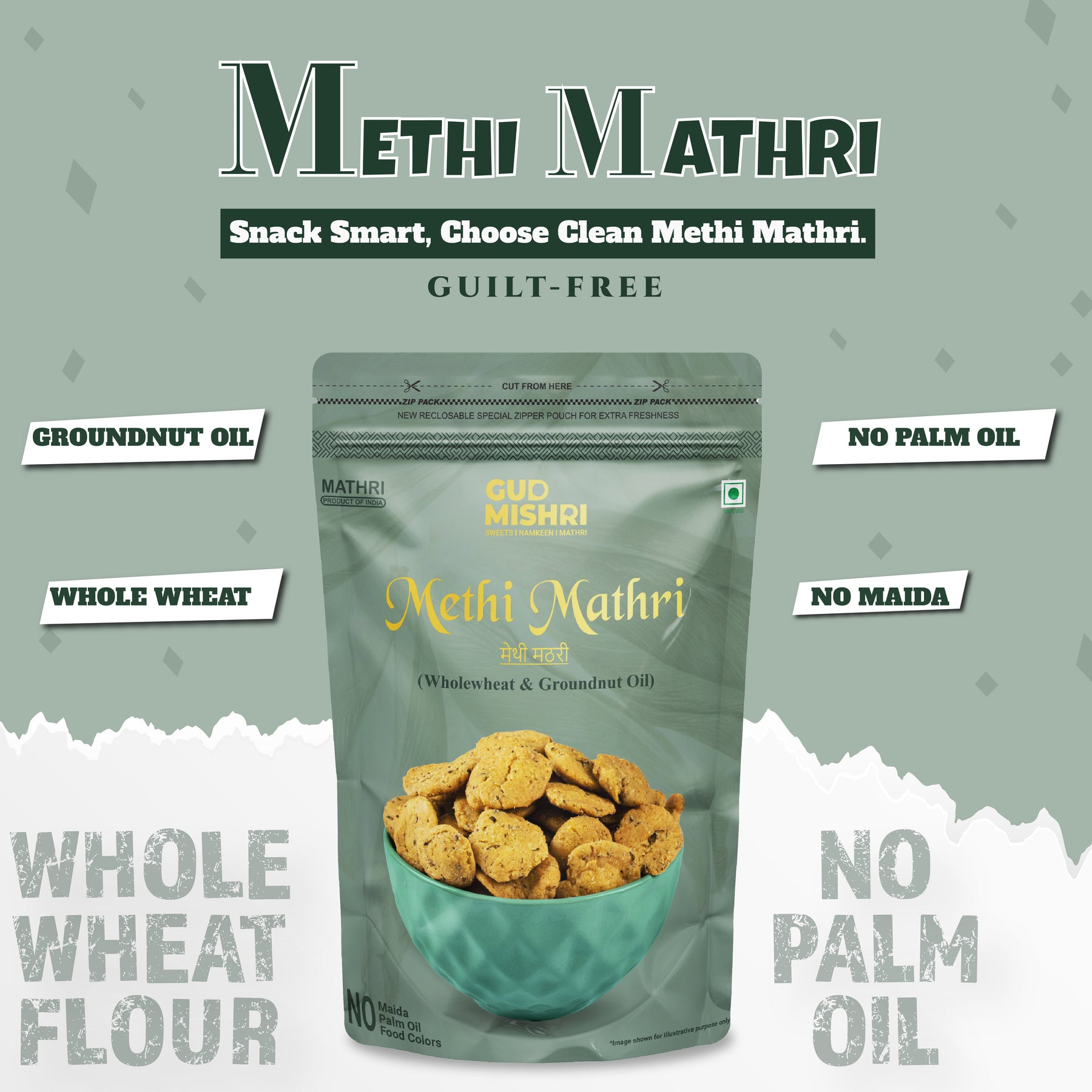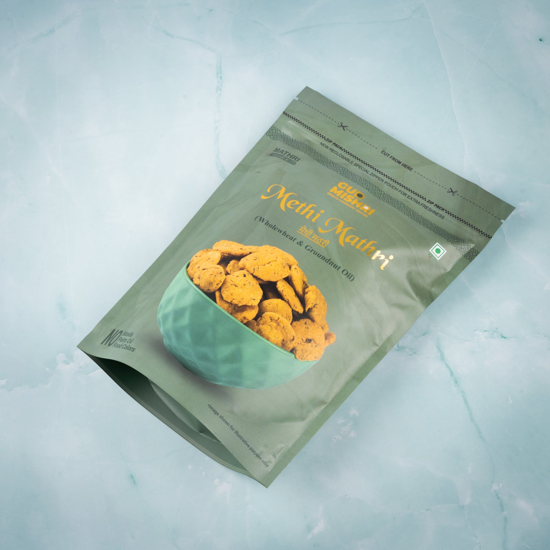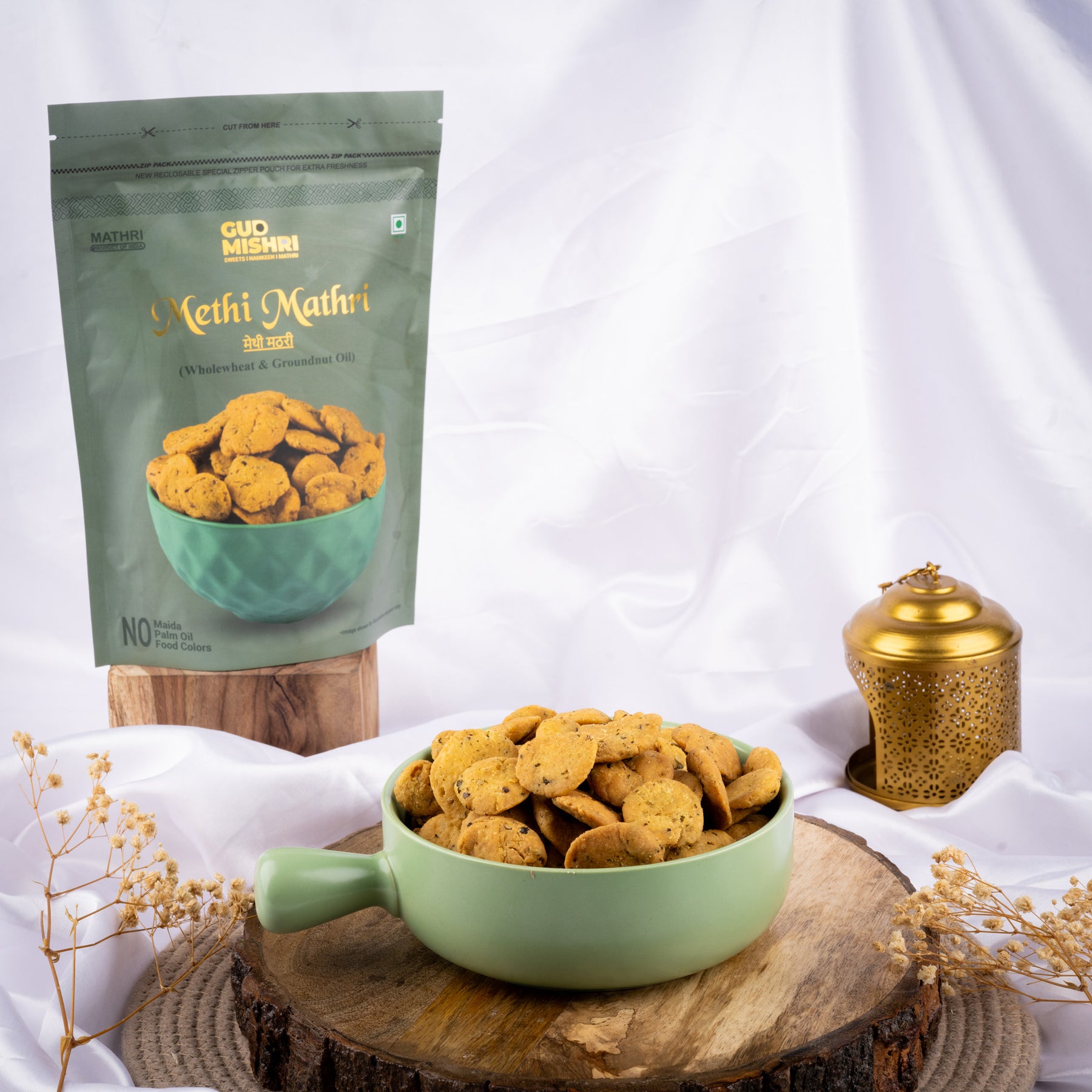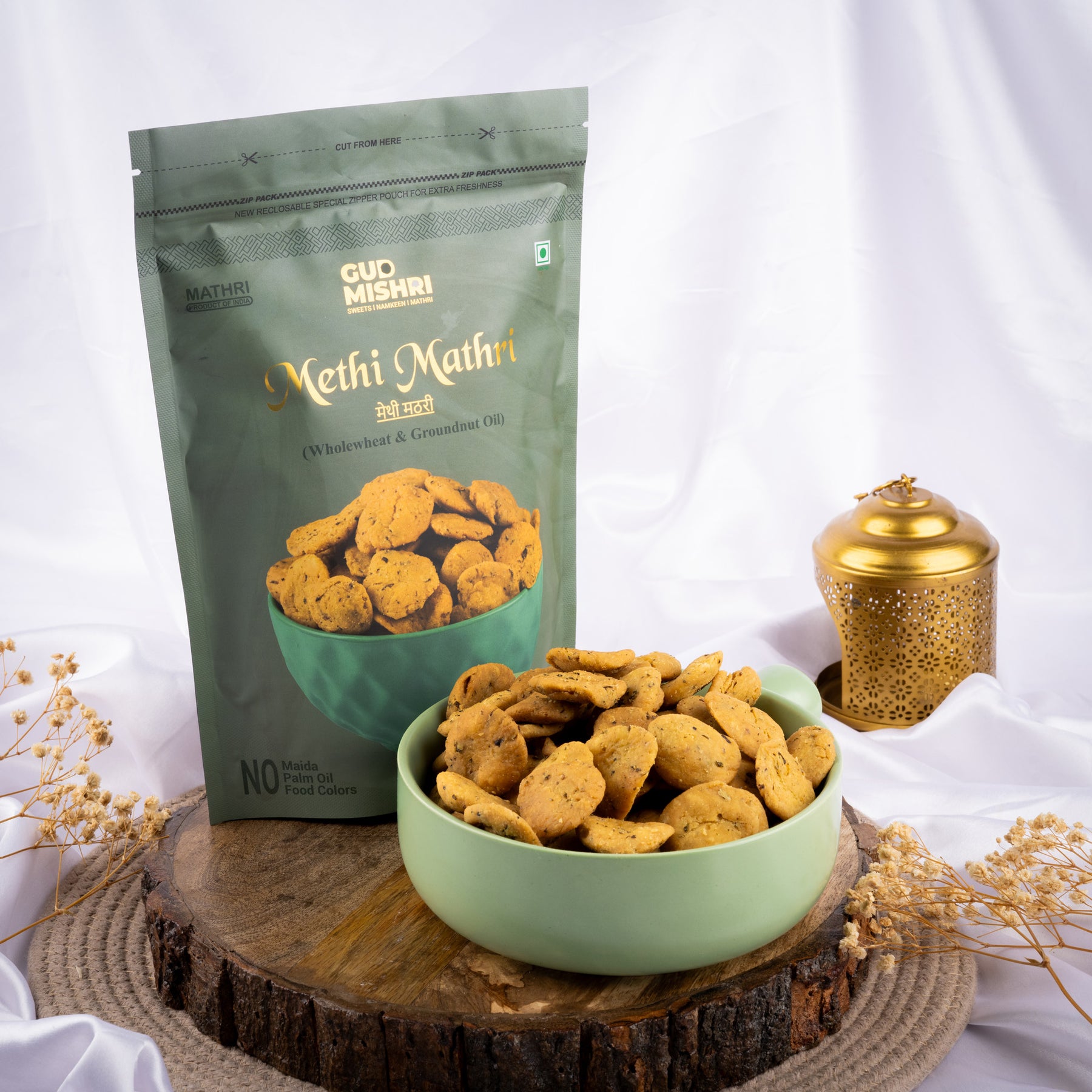 Infused with the goodness of Methi (fenugreek), these healthy mathri are not only delicious but also provide the health benefits of this nutritious herb. They’re the perfect choice for those looking for a guilt-free treat. Whether you’re craving a snack or a healthy tea time snack, Gud Mishri Methi Mathri makes the ideal choice for a crispy, satisfying snack.