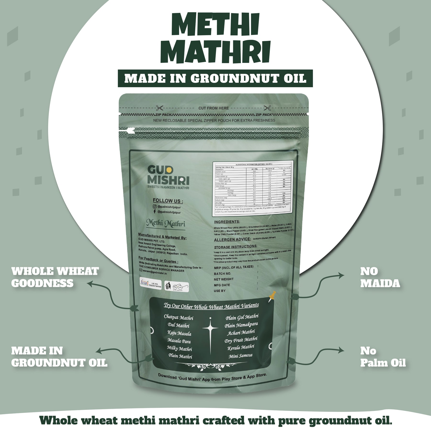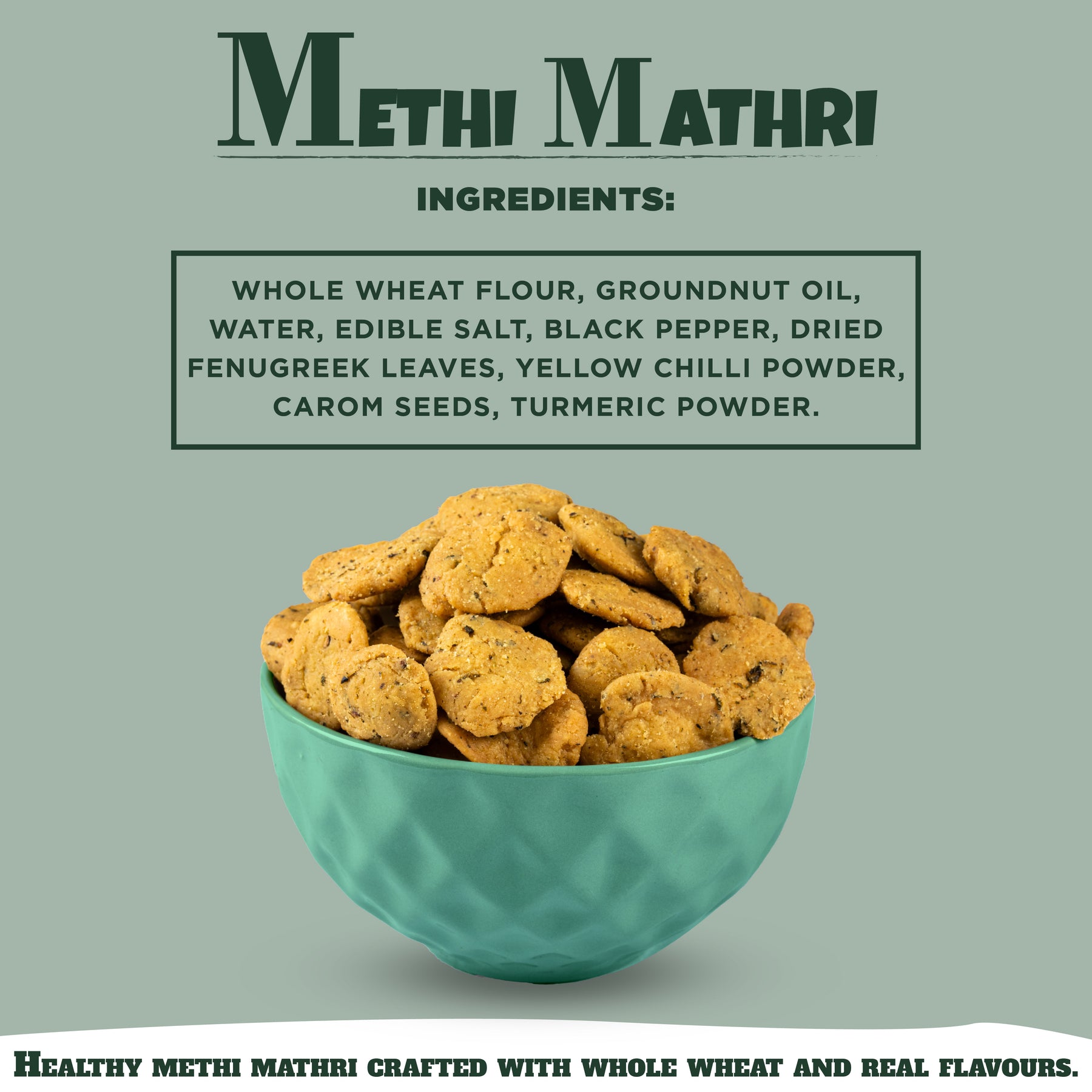 Gud Mishri Methi Mathri (400g) – Enjoy the authentic taste of Gud Mishri Methi Mathri, a wholesome and flavourful snack that’s perfect for any occasion. Made with whole wheat instead of Maida, these whole wheat mathri offer a healthier alternative to regular snacks. Prepared without palm oil, margarine, or artificial food colors, they are baked with pure groundnut oil, ensuring a natural, rich flavour in every bite.