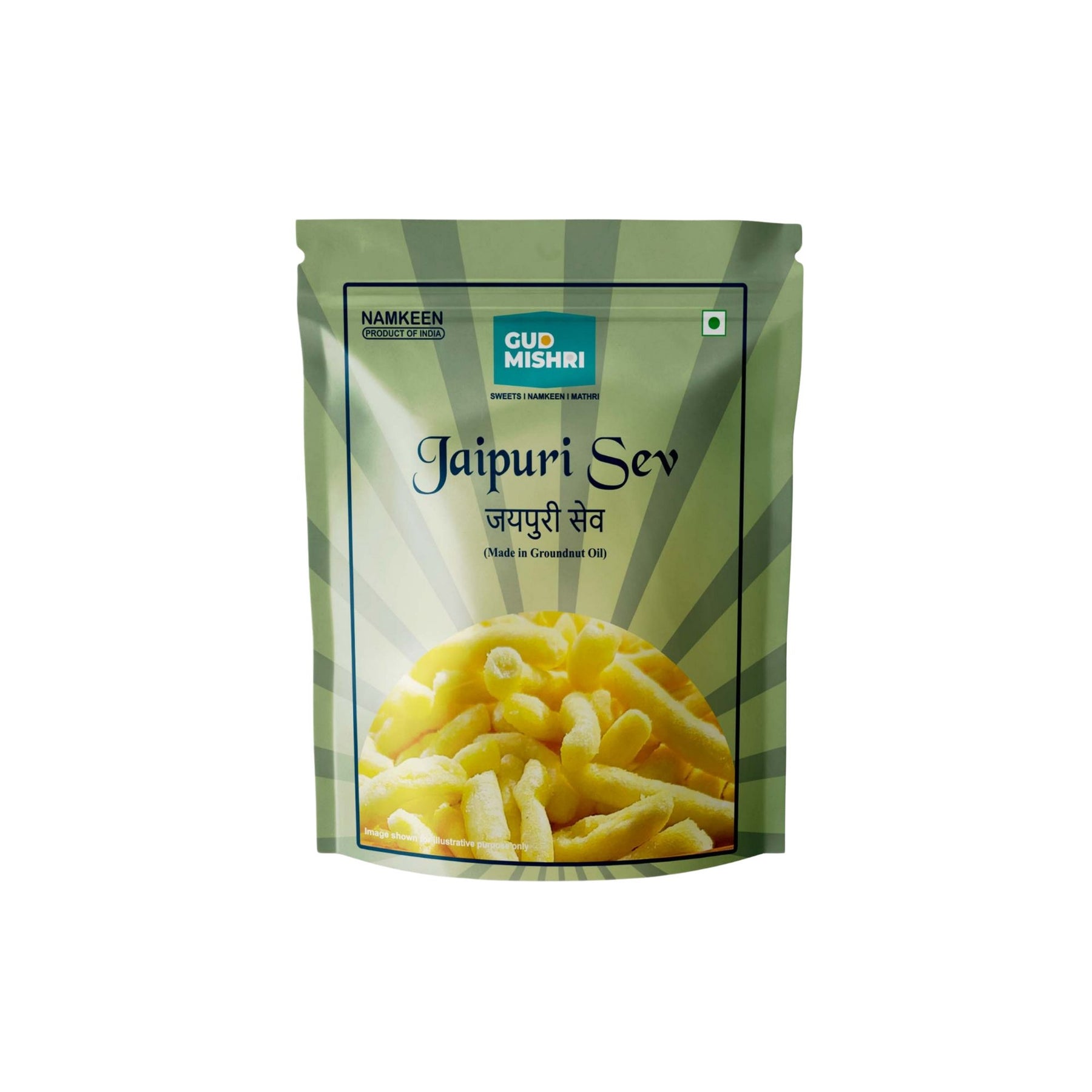 Gud Mishri Jaipuri Sev (400g) – Enjoy the traditional taste of Jaipuri Sev with Gud Mishri Jaipuri Sev. Made with gram flour and groundnut oil, this snack is a perfect blend of authentic spices and crunch. Infused with sonth, carom seeds, dry mango powder, chili powder, black salt, cumin water, black pepper, and baking soda, each bite offers a burst of flavor, making it the perfect healthy tea time snack.