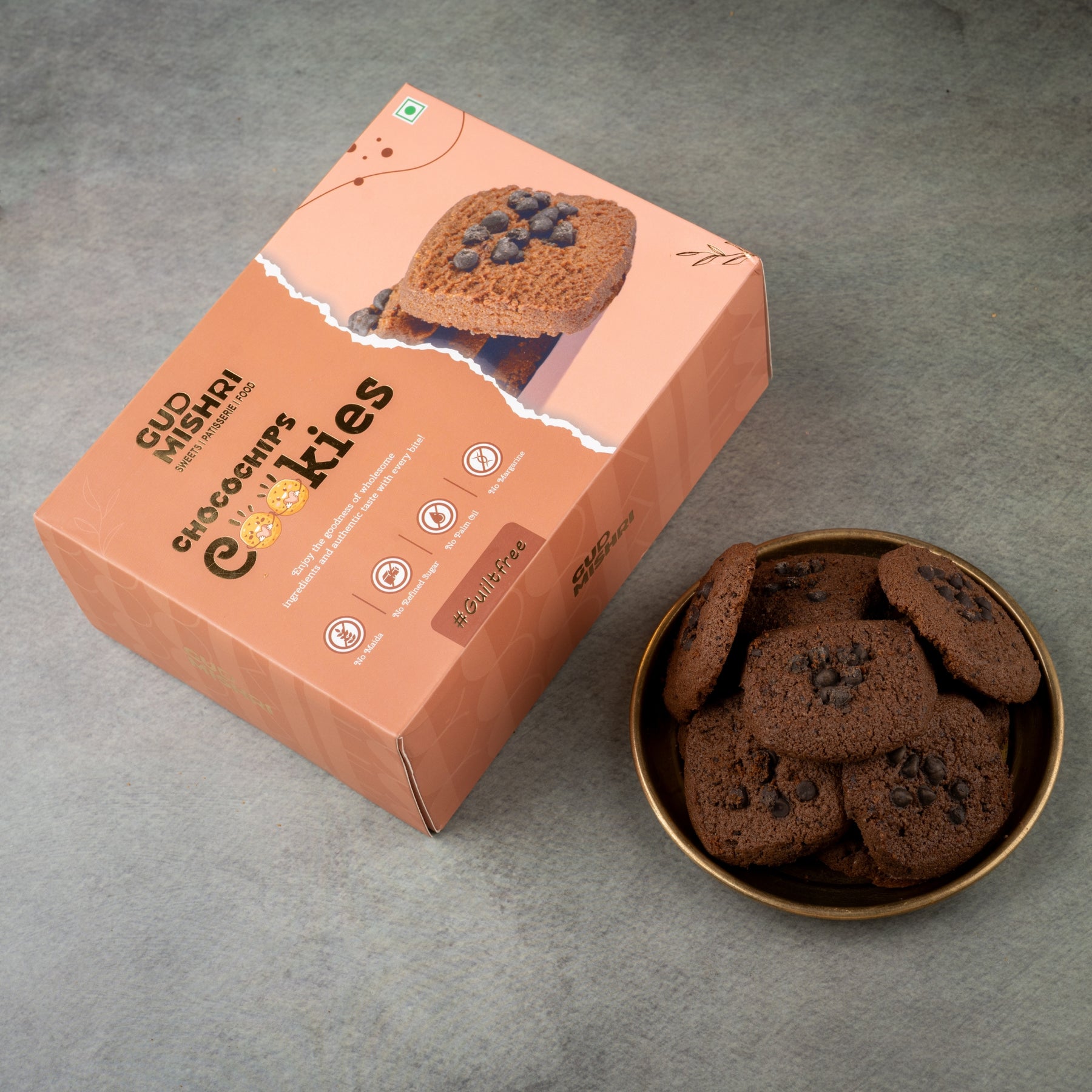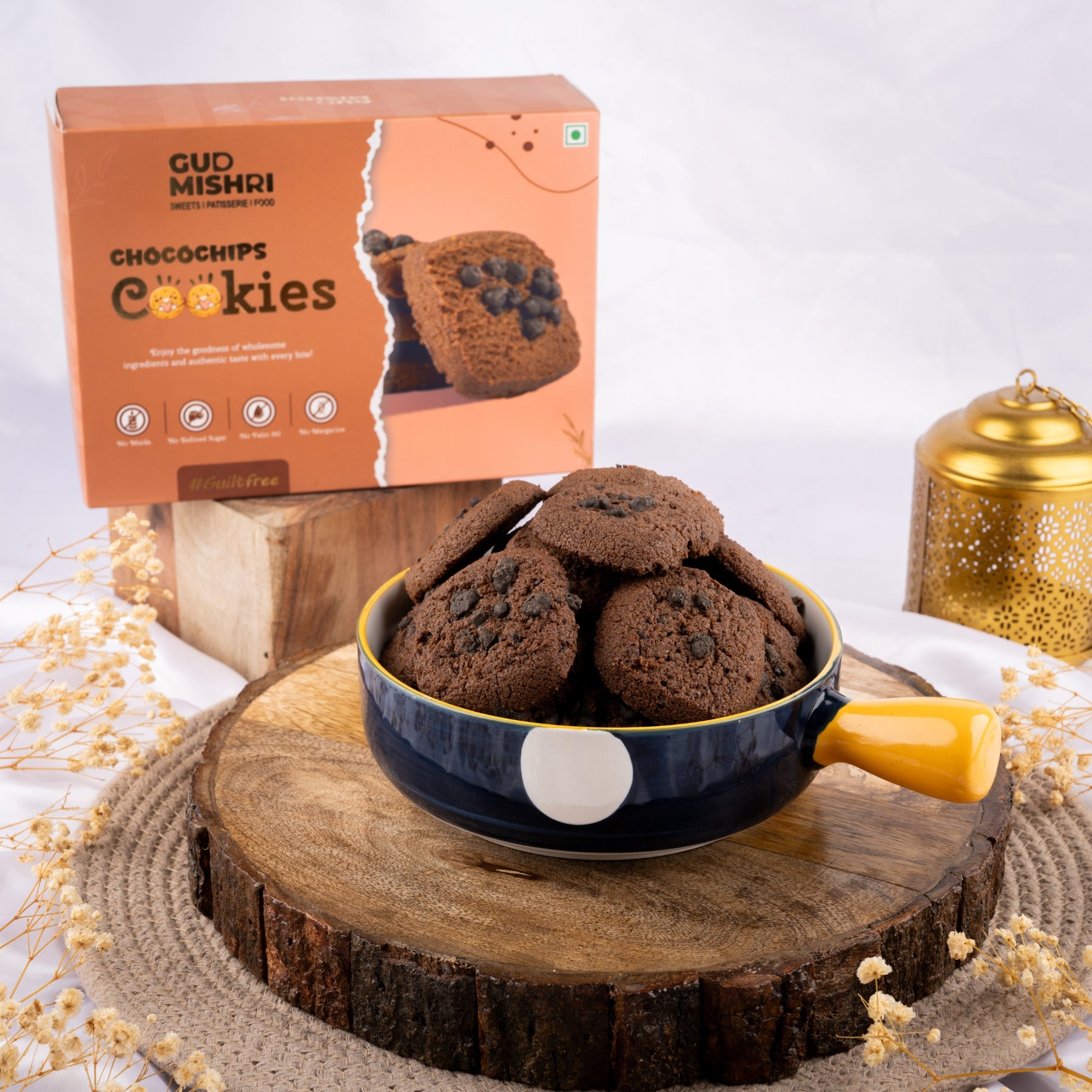 Enjoy the wholesome goodness of Gud Mishri Choco Chip Cookies, made with whole wheat, pure butter, and naturally sweetened with mishri. Free from maida, palm oil, margarine, and artificial colors, these cookies are soft, flavorful, and packed with fiber—making every bite a guilt-free, healthy treat. Perfect for snacking anytime, they bring together taste and nutrition in every bite.